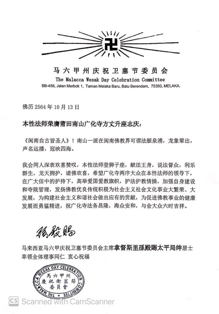 马六甲州庆祝卫塞节委员会暨孙殿赐主席贺函