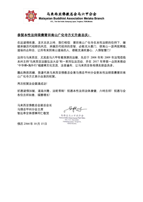 马来西亚佛教总会马六甲分会暨智达大和尚贺函