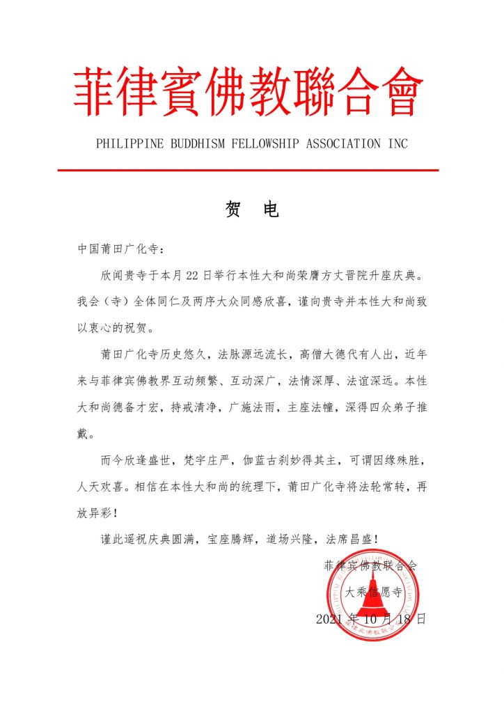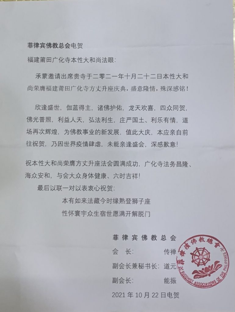 升座法会庄严肃穆,东南亚与欧美等汉传佛教界团体与寺院,如:新加坡佛教总会、新加坡广化寺、新加坡毗卢寺、菲律宾佛教联合会、菲律宾佛教总会、菲律宾大乘信愿寺、马来西亚佛教总会马六甲州分会、马六甲州庆祝卫塞节委员会、越南妙法寺、印尼茂物普门寺、印尼广化法海寺、印尼广化禅寺、印尼广化一承禅寺、印尼大乘僧伽会以及美国纽约东禅寺、洛杉矶法印寺、美国东方佛教会、美国佛教正信会、美国佛教青年会、加拿大佛教会、澳大利亚澳中佛教总会、澳纽南海佛教联合会、南普陀寺、护国报恩寺等纷纷发来贺函祝福。