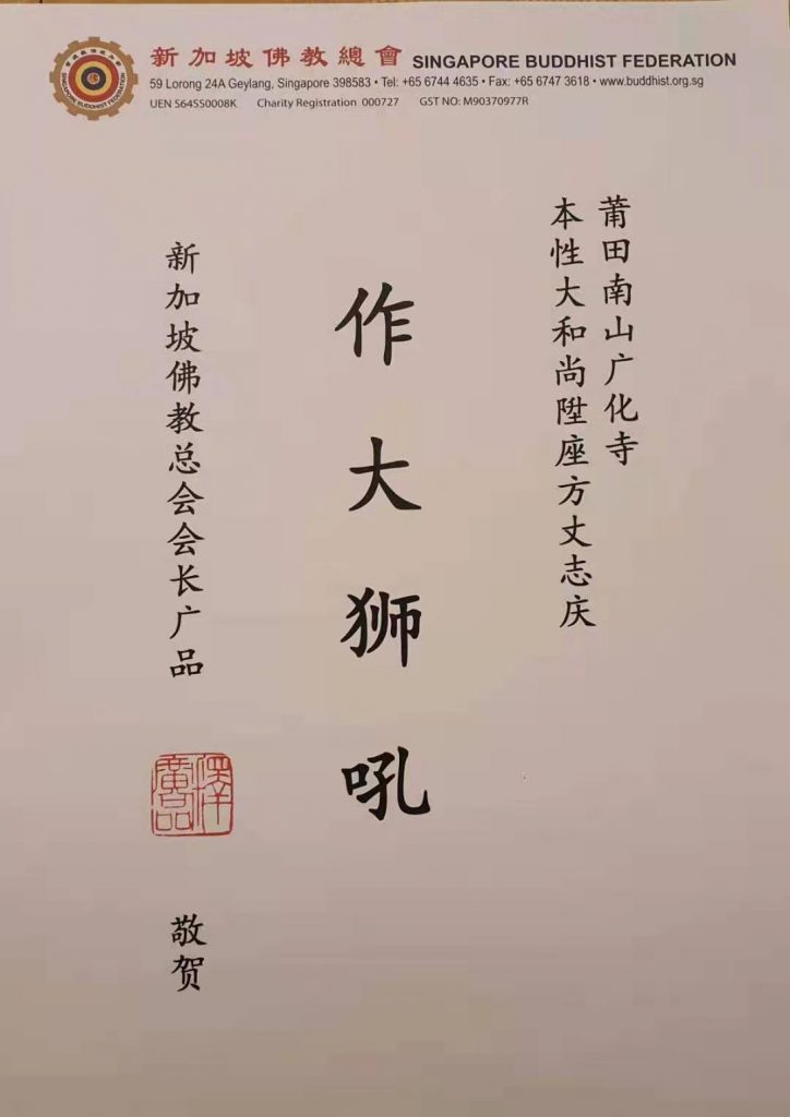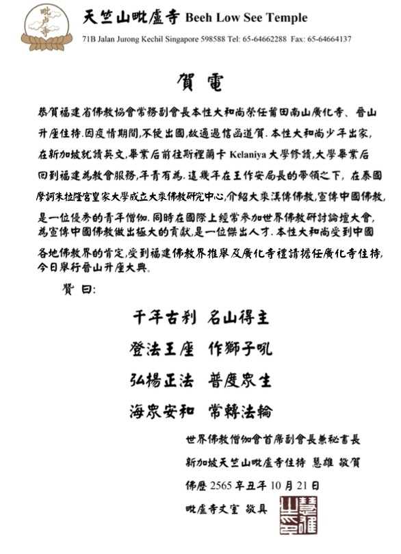新加坡天竺山毗卢寺住持慧雄大和尚贺函