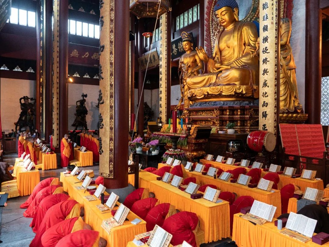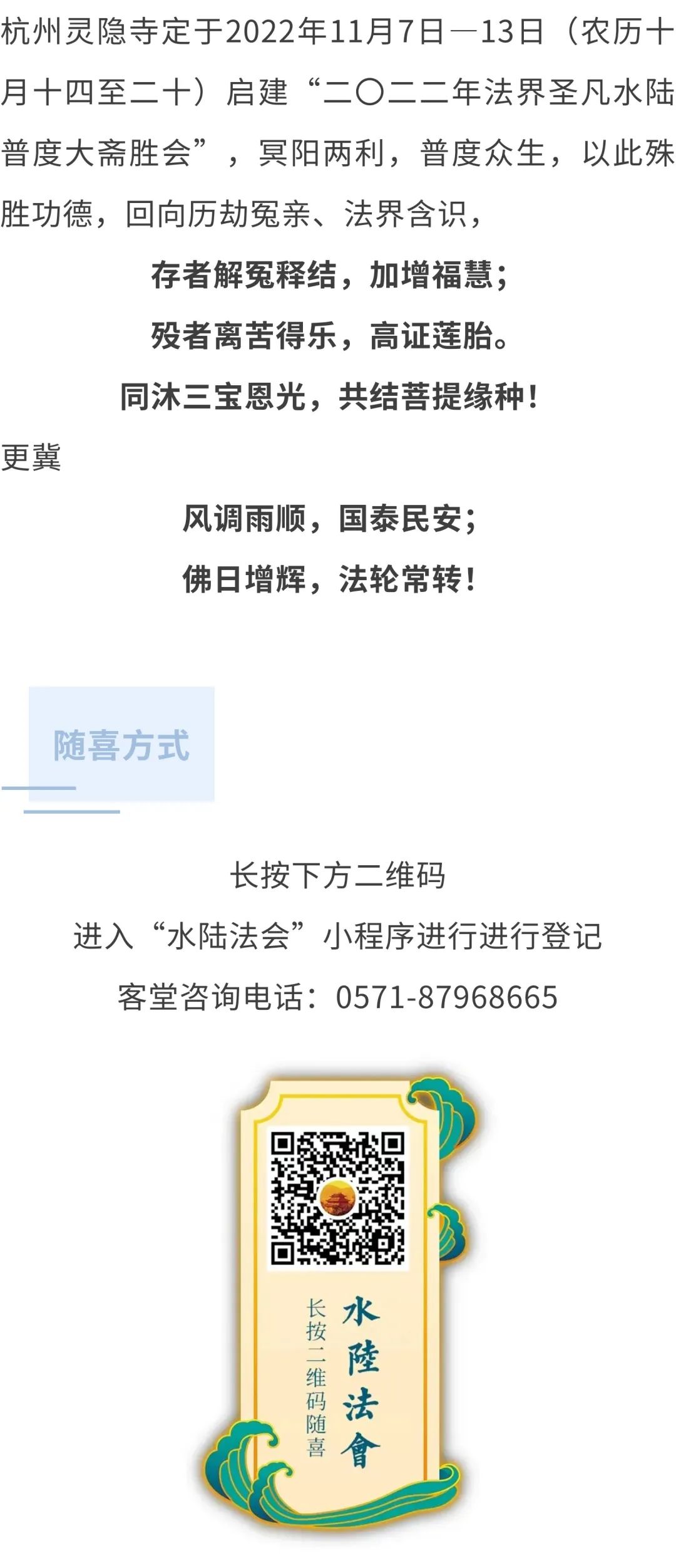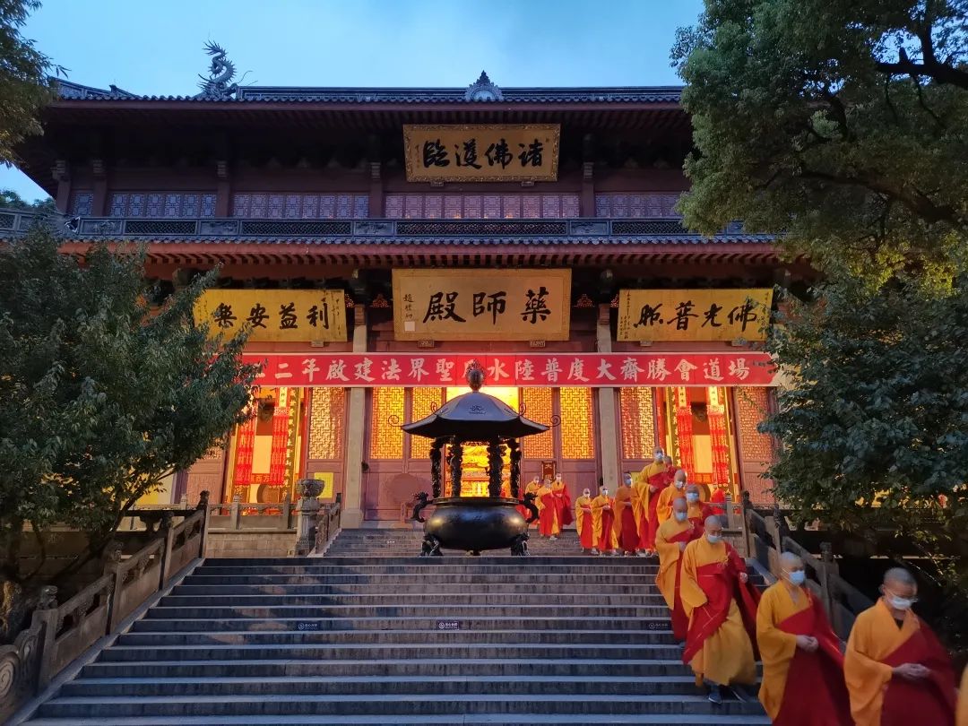 水陆法会是中国佛教经忏法事中最隆重的一种,由梁武帝的《六道慈忏》(即《梁皇忏》)和唐代密教冥道无遮大斋结合发展起来的。梁武帝由梦僧启示,后又得宝誌公劝说,因而披阅大藏,创立仪文,于天监四年(505)就金山寺修建水陆法会。至唐咸亨(670—673)中,法海寺神英法师于大觉寺义济处得到梁武帝的水陆仪文,依照修斋,遂复流行于世。北宋杨锷撰有《水陆仪》三卷,苏轼撰《水陆法赞》十六篇,称为眉山水陆。南宋史浩曾施田给月波山修设水陆大斋,并亲撰仪文四卷。南宋末志磐法师又撰新仪六卷,并绘像二十六轴。明代称此为“南水陆”,而对金山仪文称“北水陆”。明末莲池大师重订志磐法师的水陆仪文,成《水陆修斋仪轨》六卷。清仪润依之撰成《水陆大斋仪轨会本》六卷,为现行水陆仪本。其后咫观又依祩宏的重订本详加论述,成《鸡园水陆通论》九卷,并撰《水陆大斋法轮宝忏》十卷,皆为现行水陆所取法。