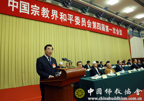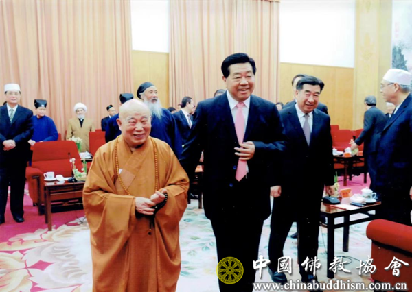 ▲(2012年1月16日,中共中央政治局常委、全国政协主席贾庆林邀请中国佛教协会会长传印长老等全国性宗教团体负责人到中南海座谈)