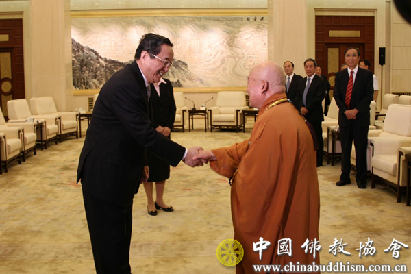 ▲(2013年8月26日,中共中央政治局常委、全国政协主席俞正声在人民大会堂会见了传印会长等出席中国佛教协会成立六十周年纪念会的协会领导班子成员)