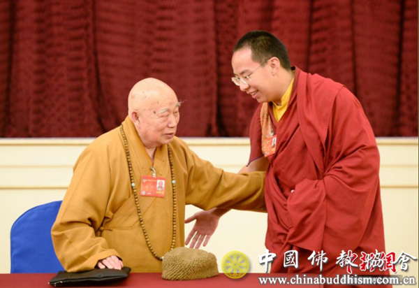 ▲(2014年3月5日,全国政协十二届二次会议宗教界别分组讨论在北京举行,全国政协常委、中国佛教协会会长传印长老,全国政协常委、中国佛教协会副会长第十一世班禅额尔德尼·确吉杰布参加讨论)