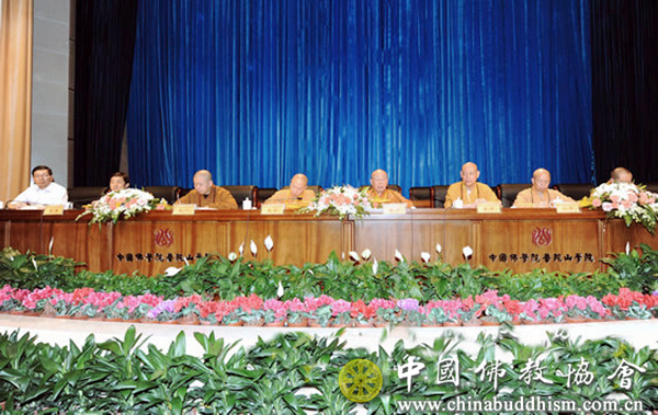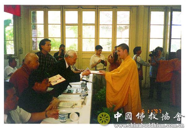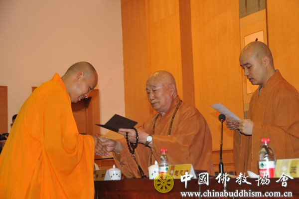 ▲(2014年7月19日,中国佛学院举行首批教师资格证书及学位授予资格证书颁发仪式,图为中国佛教协会会长、中国佛学院院长传印长老颁发证书)