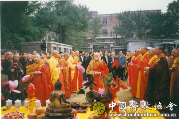 ▲(1996年10月21日,中国佛学院举行教学楼奠基洒净仪式,图为中国佛教协会会长、中国佛学院院长赵朴初居士,中国佛教协会副会长茗山长老,中国佛学院副院长传印法师出席法会仪式)