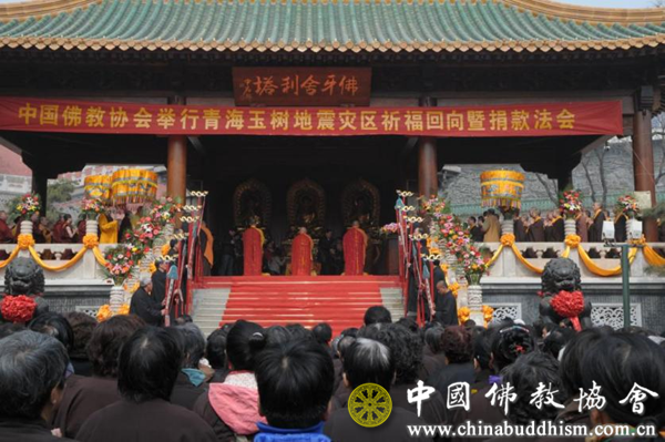 ▲(2010年4月16日,中国佛教协会在北京灵光寺举行青海玉树地震灾区祈福回向暨捐款法会,传印会长等主法)