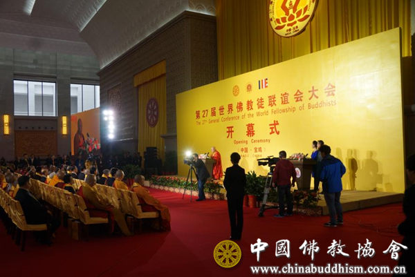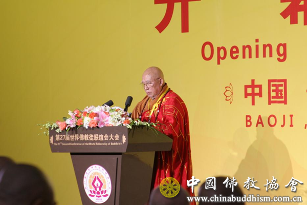 ▲(2014年10月16日至18日,第27届世界佛教徒联谊会大会在陕西宝鸡举行,图为中国佛教协会会长传印长老出席开幕式并致辞)