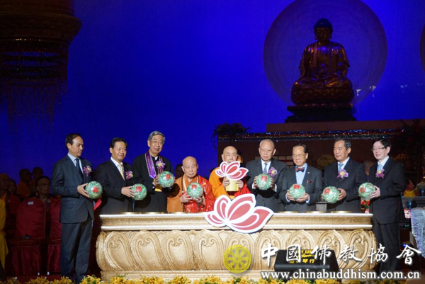▲(2012年4月26日,第三届世界佛教论坛开幕式在香港红磡体育馆隆重举行,图为传印会长等嘉宾为论坛启幕)
