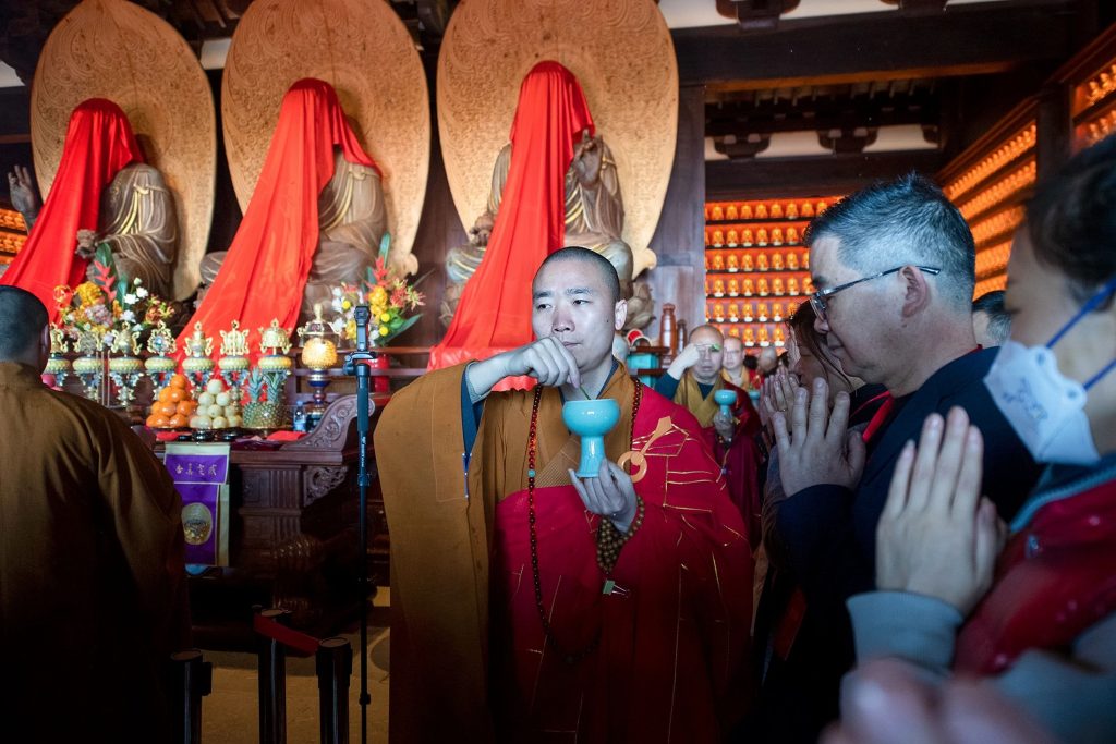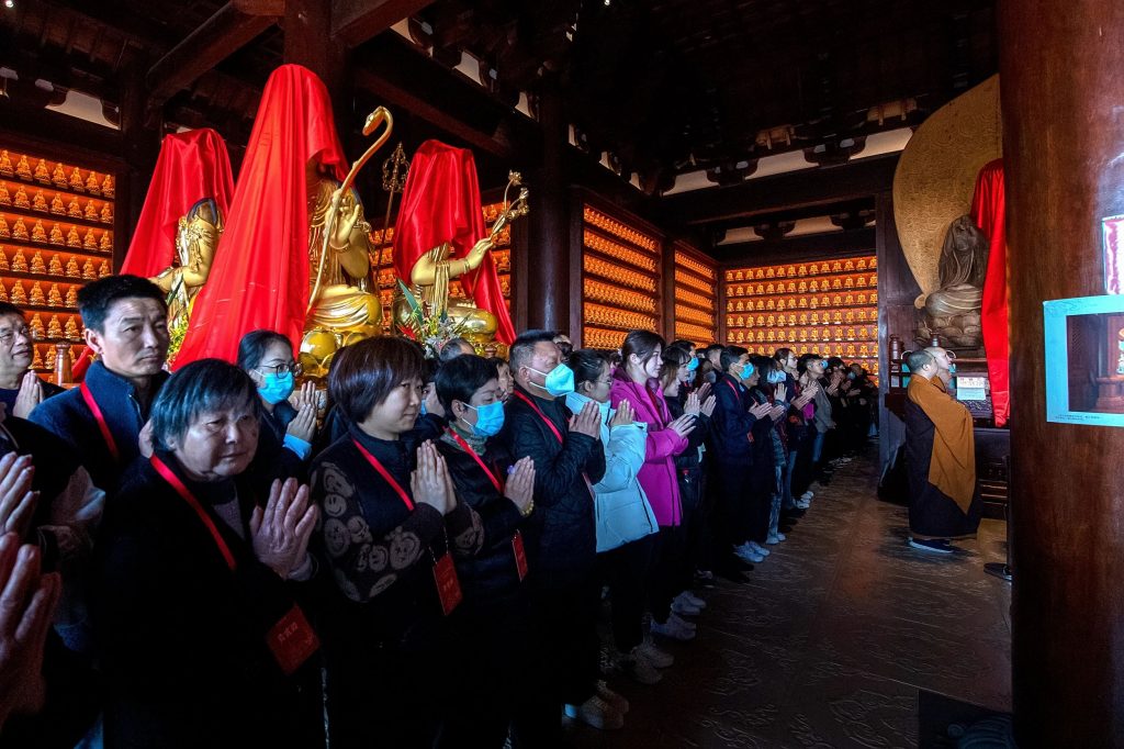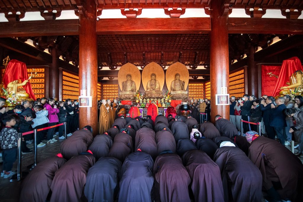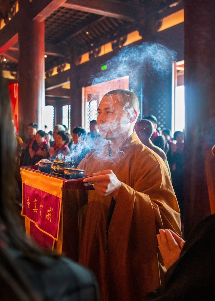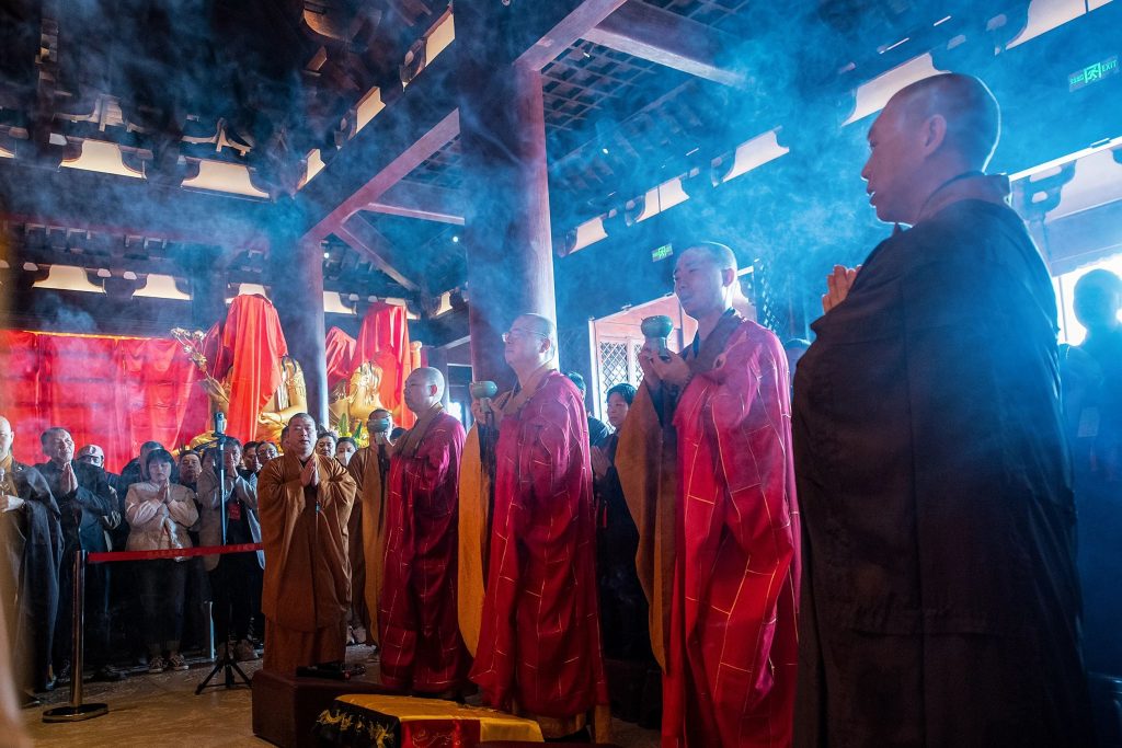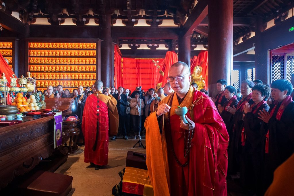 4月9日 恭逢观世音菩萨圣诞吉辰,径山万寿禅寺两序大众是日清晨朝课祝圣并于当日上午吉时隆重举行凌霄阁三世佛及诸菩萨开光法会。开光法会由戒兴法师、法涌法师、圣果法师主法。凌霄阁佛像供奉功德主,护法善信参加开光法会。
