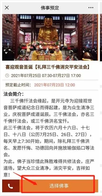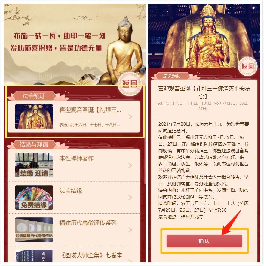 3、点击法会预订里的喜迎观音圣诞【礼拜三千佛消灾平安法会】,再点击“确认”,选项目确认,正确填写信息,最后完成支付,即可。