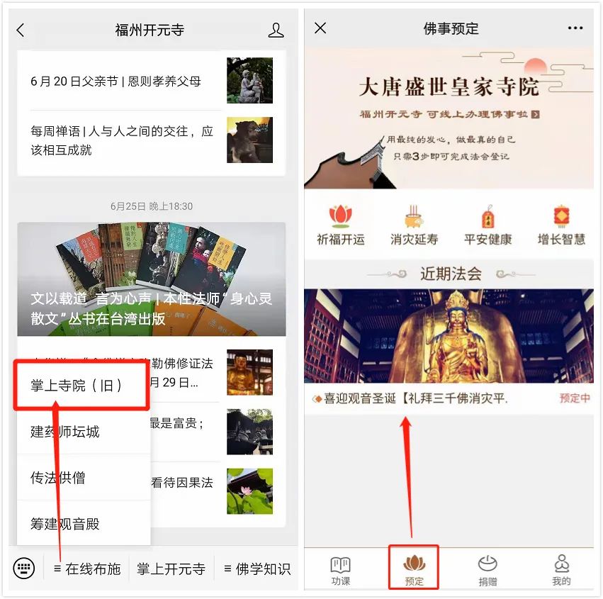 2、进入公众号,点击在线布施的“掌上寺院(旧)”,点击“预定”进入喜迎观音圣诞【礼拜三千佛消灾平安法会】预约页面。
