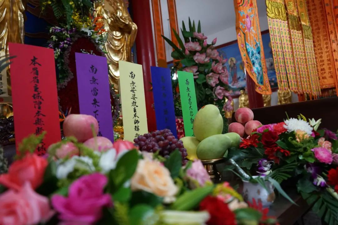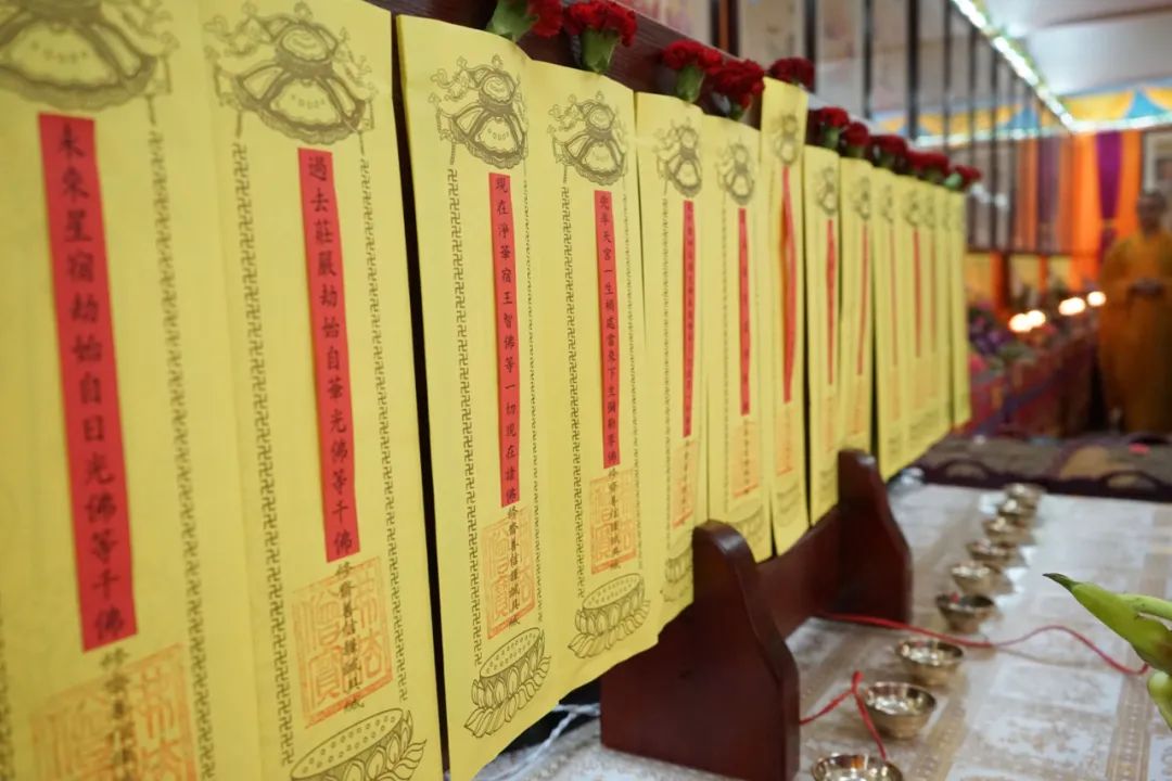 2、发符悬幡:发符就是发邀请函上达天庭下达地府,召告人天法会讯息,使诸佛菩萨及六道众生来参加法会。悬幡就是在法会现场高立旗幡,另一旁悬挂九莲灯为照明、指引,使受邀请者顺利来临。