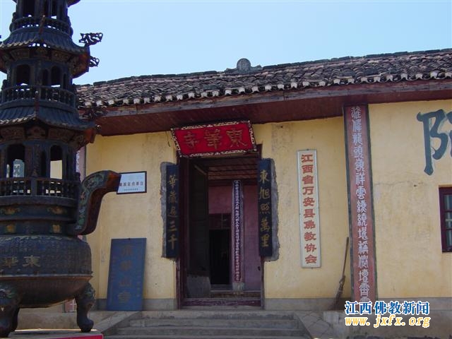 东华山寺,原名玉华观,位于万安县东枫林蕉源香谷山之巅,与枧头的彭家凹、五丰的月明三乡分水,清属三都,海拔562米。汉、晋时为张(名道陵,号天师)葛(名洪,号仙翁)许(名逊,号真君)炼丹处。后因佛法东传,道教日衰,逐被佛教取之,宋嘉定时改名仙坛寺,为僧家修行处,公元1324年,临济宗22世普现禅师在此弘扬正教,普现圆寂后,先后由无碍、隐修继承衣钵。元末时,道士许月评藉以为修道,复更名东华观,清乾隆时改称为庵,康熙间知县马之骅捐俸重修,嘉庆间知县刘俊德复修。有载寺内历代住持为:云影(1661—1741)、雪浪(号源贯,1670—1748)、广悟、广慎、继慧、继德、本礼、觉州、吕信等禅师。