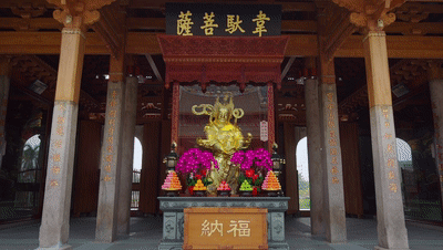 殿后韦驮菩萨按杵而立,威武异常;东西两侧四大天王怒目环视,护持佛法。