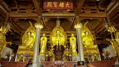 穿过天王殿,映入眼帘的便是汉传佛教寺院正殿——大雄宝殿,俗称“大殿”,供奉佛陀。其中“大雄”是佛的德号、是对佛的尊称,意指佛有大力量,能够降伏四魔。