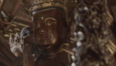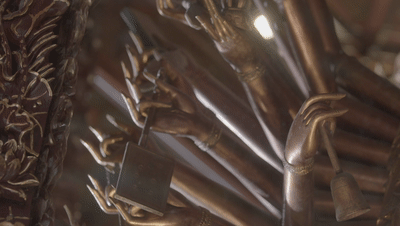 殿阁中供奉四尊观音像,分立在四个方位,正中一尊为双臂观音,端坐在莲花之上,双目垂帘,神态安详,其余三尊为四十八臂观音,掌中各雕一只手眼,手持多种神器,姿态不一,各臻其妙。