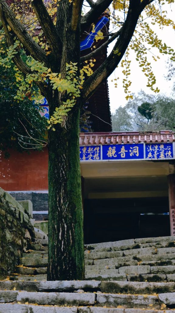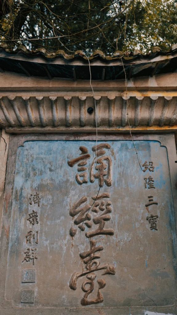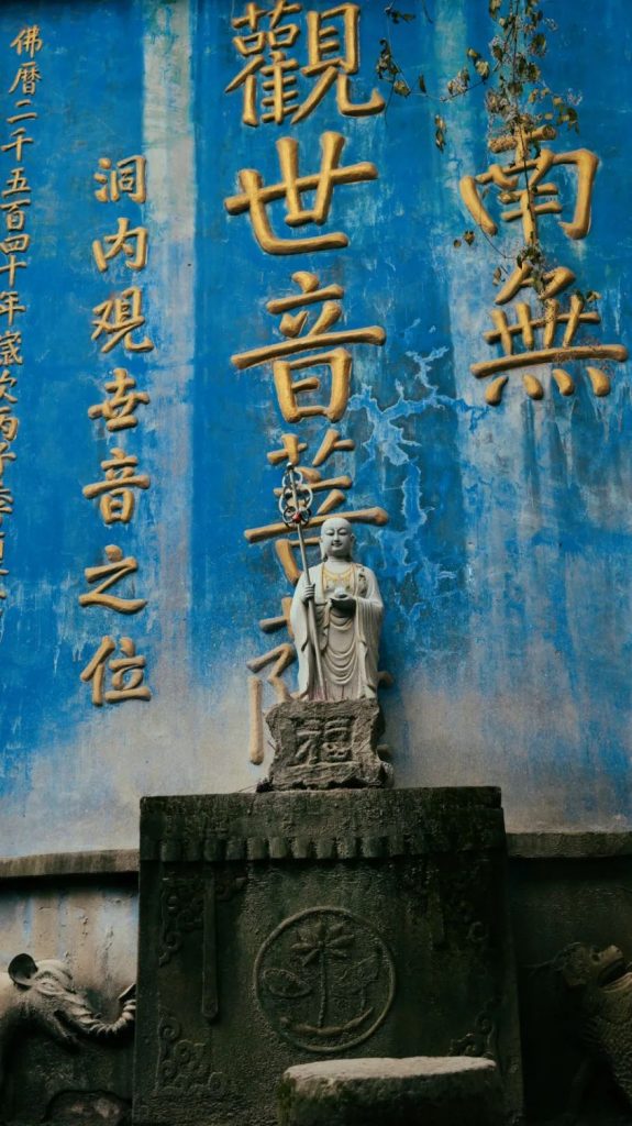 进入山门,沿着石阶往里走,约莫三四十级台阶,只见一方照壁高耸眼前,同样是蓝底金字,上书“南无观世音菩萨洞内观世音之位”,左右有联曰:悲念广大护持众生千手眼,誓愿宏深普利群机一身心。与照壁比邻有一小照壁,上书:“诵经台,绍隆三宝,济众利群”等字样。