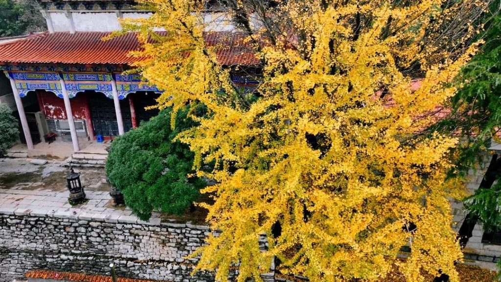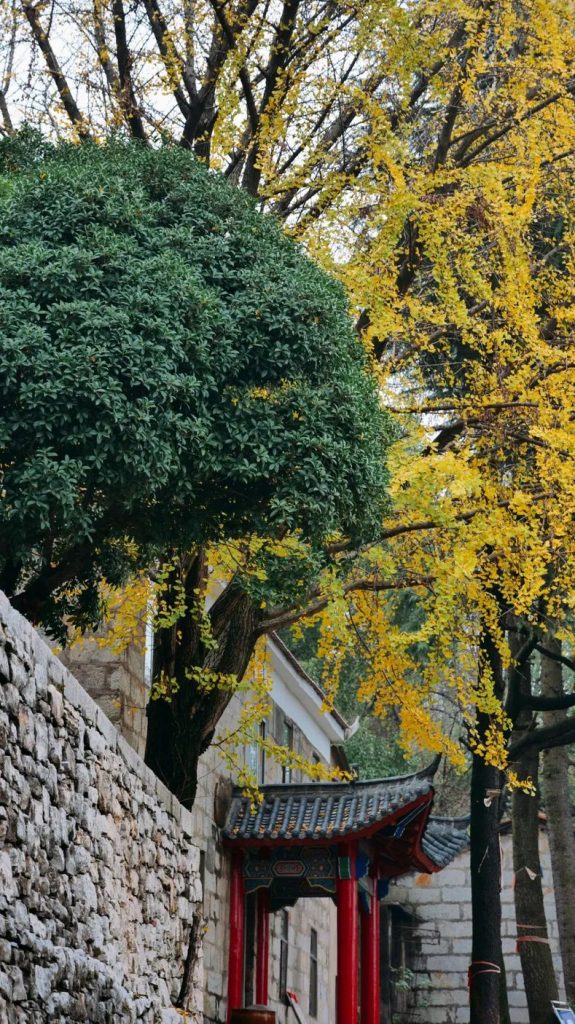 门前靠右有一颗银杏树,直径足有四五十公分,此时树叶一片金黄,散落一地,落英缤纷的样子,吸引着不少游客在此打卡留念。