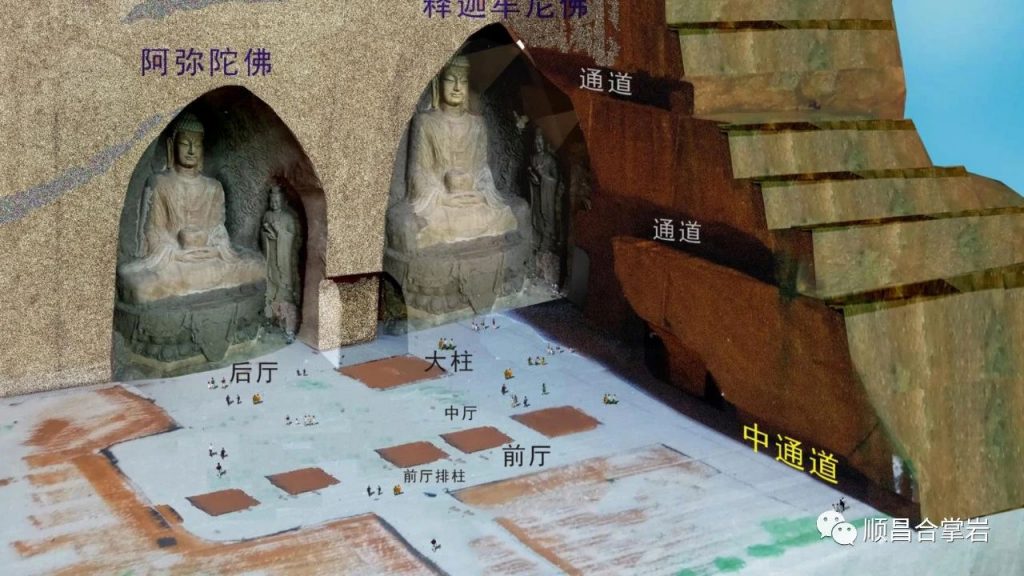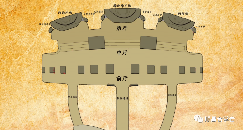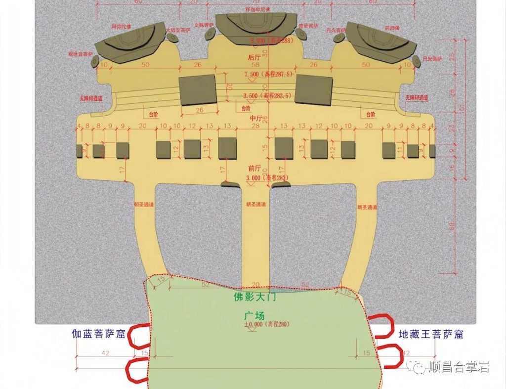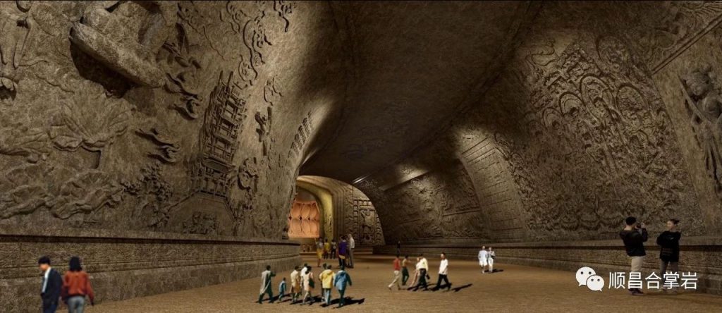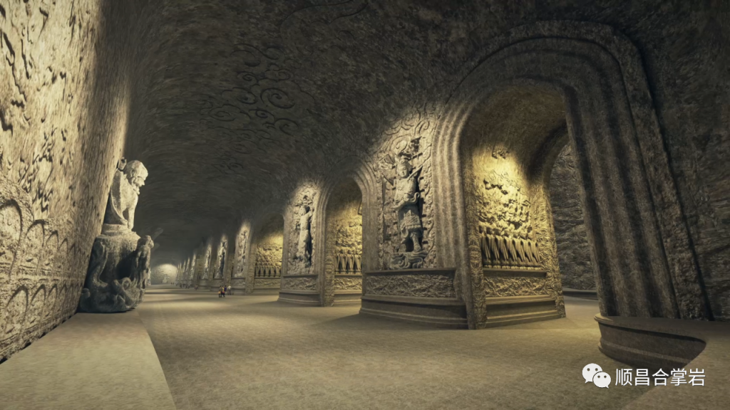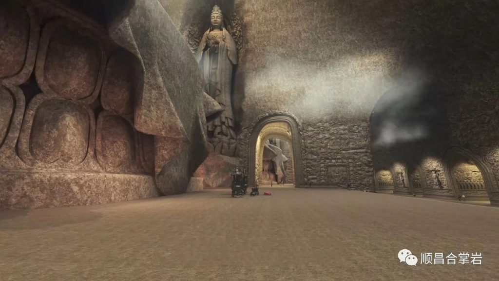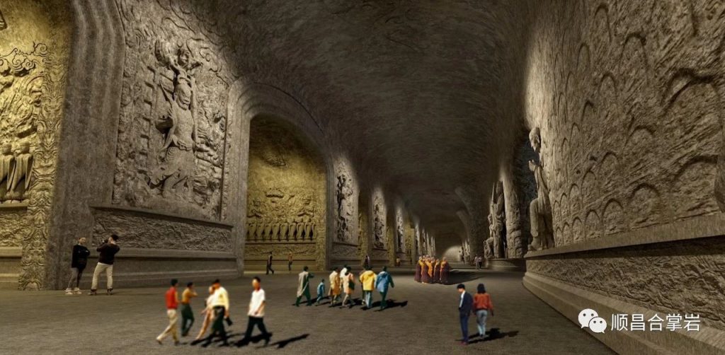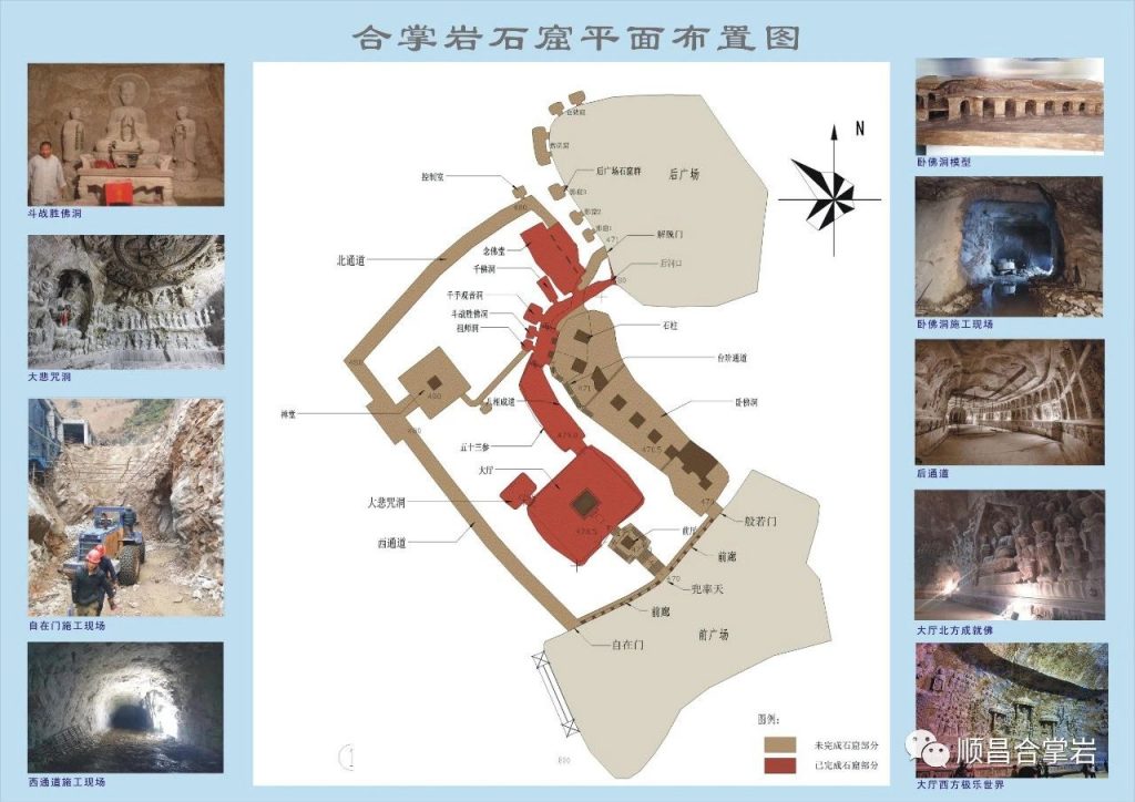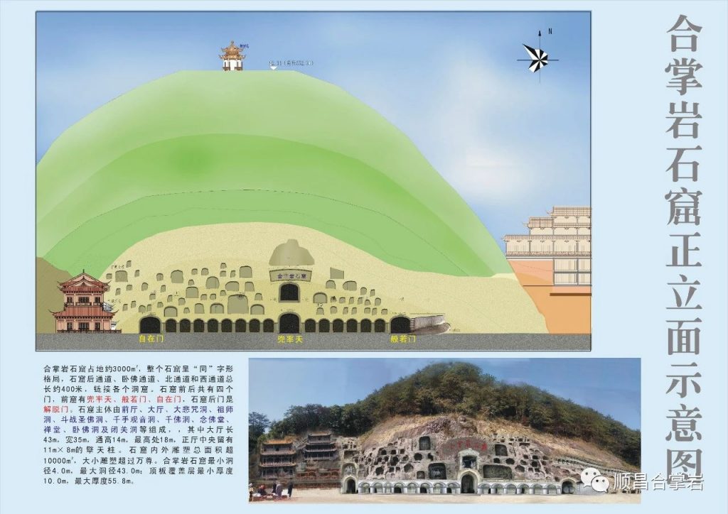 “合掌岩石窟”整个石窟呈“同”字形格局,石窟前后共有四个门,前窟有兜率天、般若门、自在门,石窟后门是解脱门。石窟中轴从前厅、大厅、大悲咒洞、连接后通道八相成道、五十三参组雕,以及祖师洞、斗战圣佛洞、千手观音洞、三千佛洞、到念佛堂。石窟后通道、卧佛通道、北通道和西通道总长约500多米,链接各个洞窟,如禅堂、卧佛洞及各个洞窟,建筑面积约1万平方米。