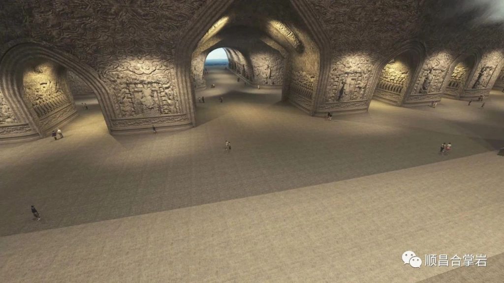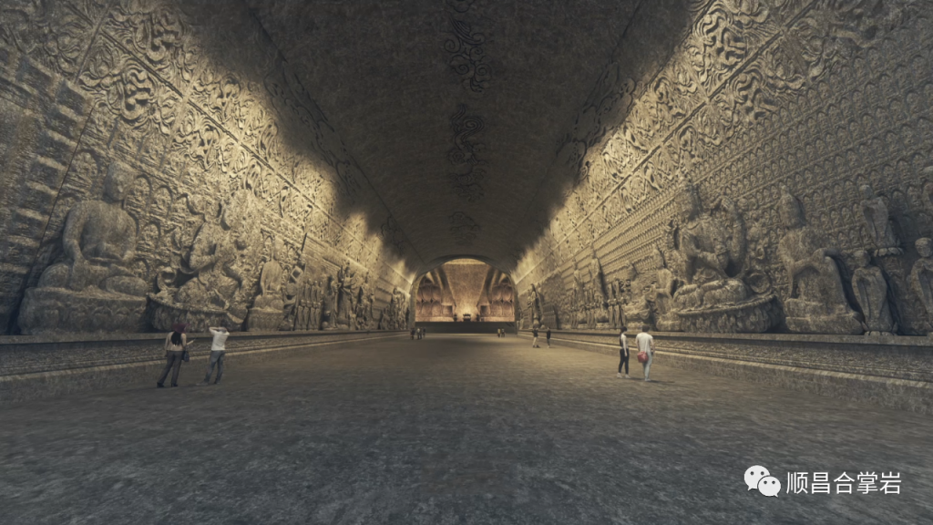 三、 前厅:东三大佛石窟的前厅是一个通廊式的空间,全长260米,洞宽17米,洞高16米。中通道两侧大力金刚和其他功能性小石窟构成一个面积为5000多平方米的洞内石雕群。这是石窟第一个逐级上升的空间,根据石窟稳定性评价的要求从洞体16米呈开放弧线展开,既节约工程量又满足了视觉仰望的要求。