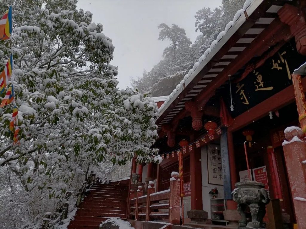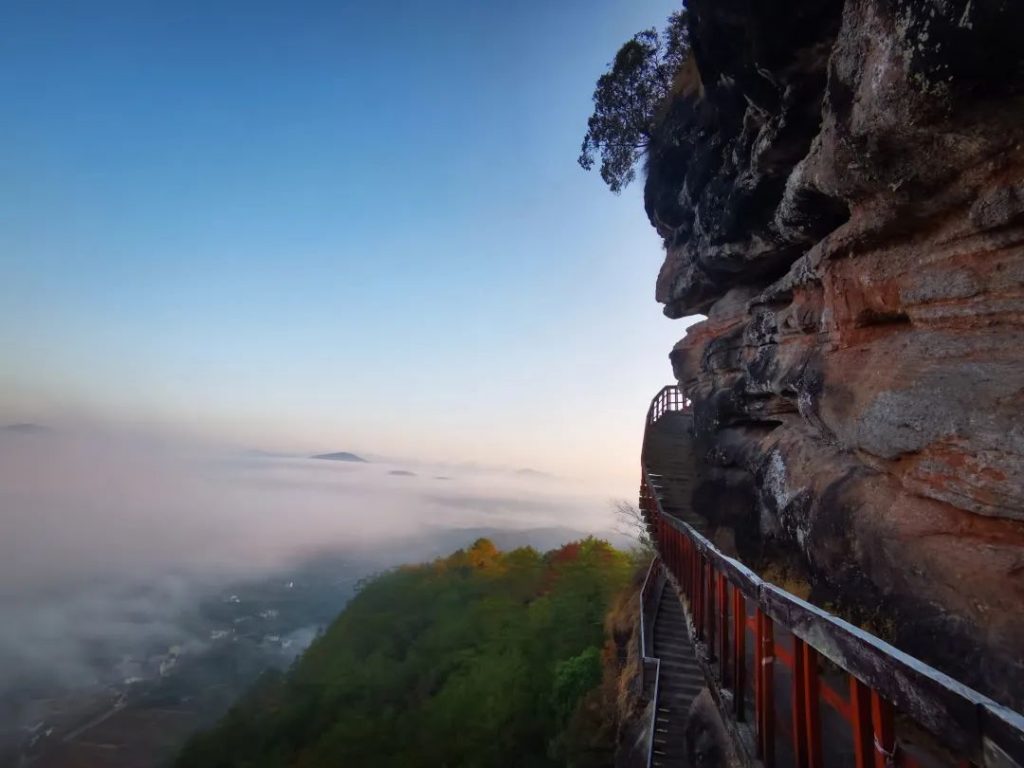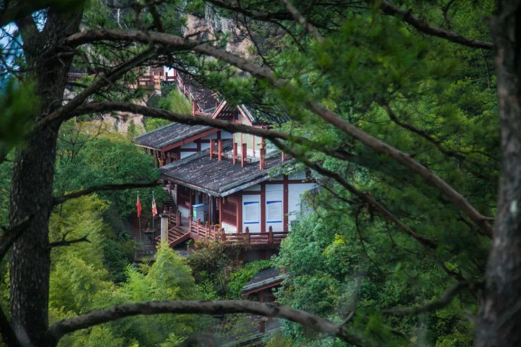 当年的进山野径,如今成了一条1358级的石磴道。从山麓到寺院山门,共1100级台阶。从山门到大殿门前,还有258级台阶。在丹岩险峰间,这是上山下山唯一的路。尽管从寺院里就能看见山下的那条公路,但它无法往寺院延伸。不通公路或许有些遗憾,却让它至今仍有清净脱尘之态。那条唯一的进山石磴道,只是稍稍露了个头,就藏在幽幽的树林之中了。山外的世界几多变迁,这里流淌的是千年不变的翠色与清风。