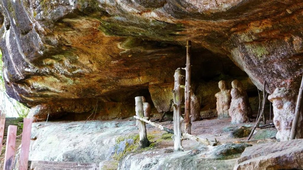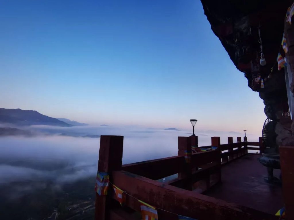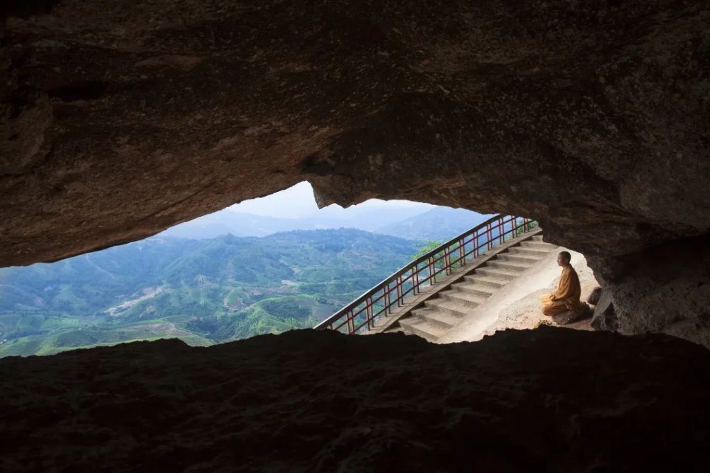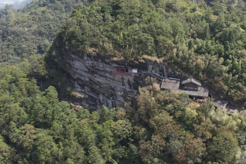 武夷山的丹霞地貌,成就了这片高崖上的岩穴。大雄宝殿,观音殿,扣冰古佛殿,全都镶嵌于崖洞里。殿内不撑一柱,殿顶不盖一瓦。连接这些殿堂的,是峭壁上的一条弯折的栈道。偶有从殿洞外延的飞檐翘角,点染出几分仙山琼阁的意韵。云雾来时,从山麓望去,寺院如浮于云端之上,一派超脱气象,引人遐思联翩。
