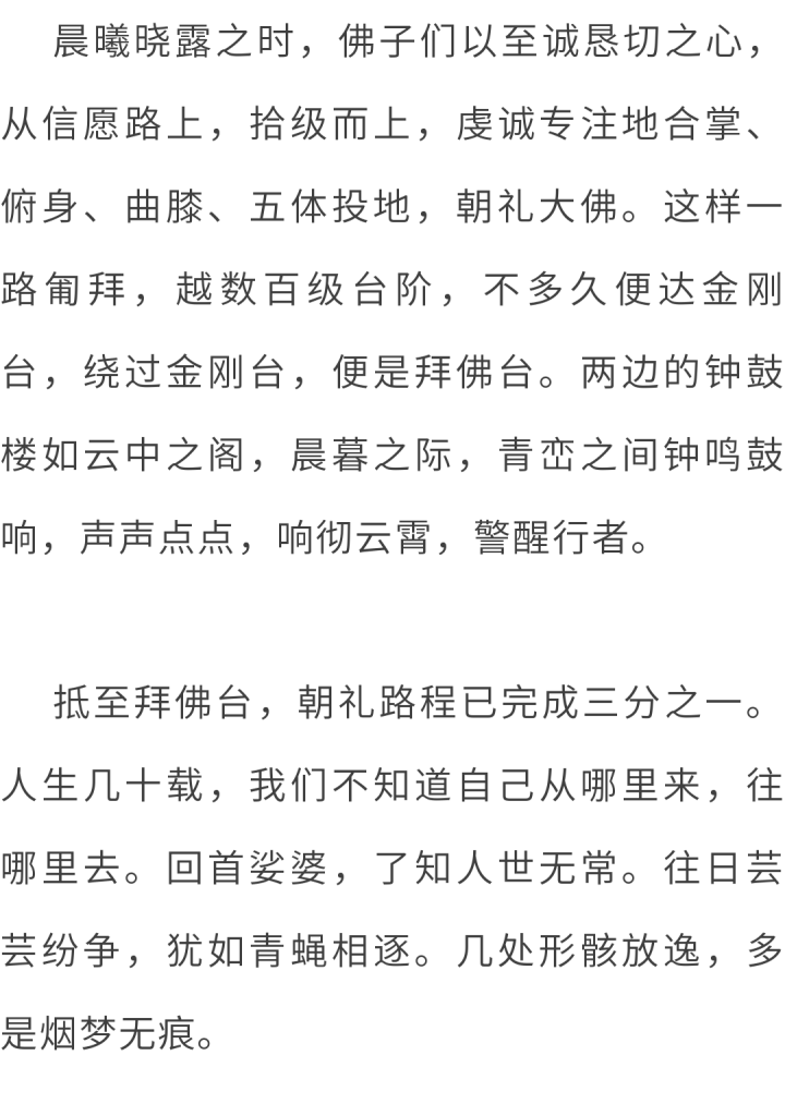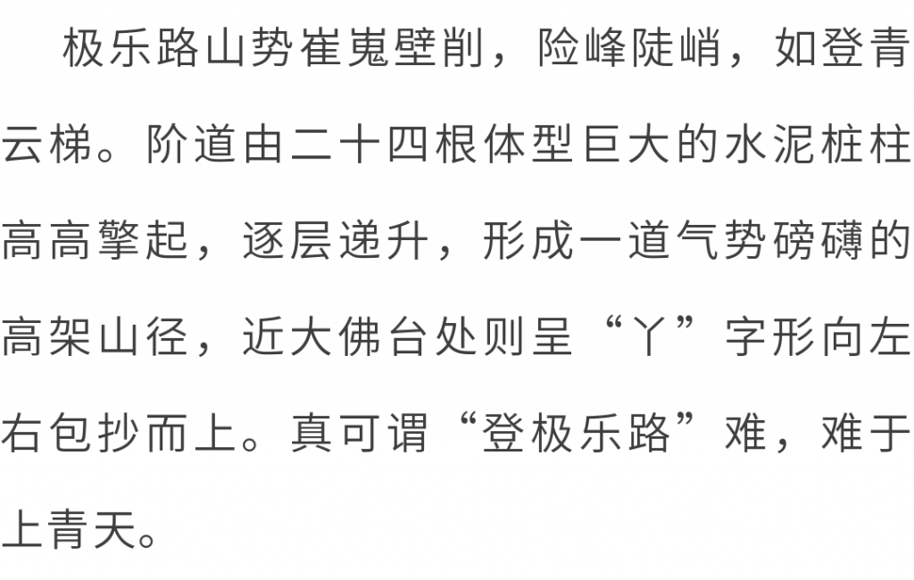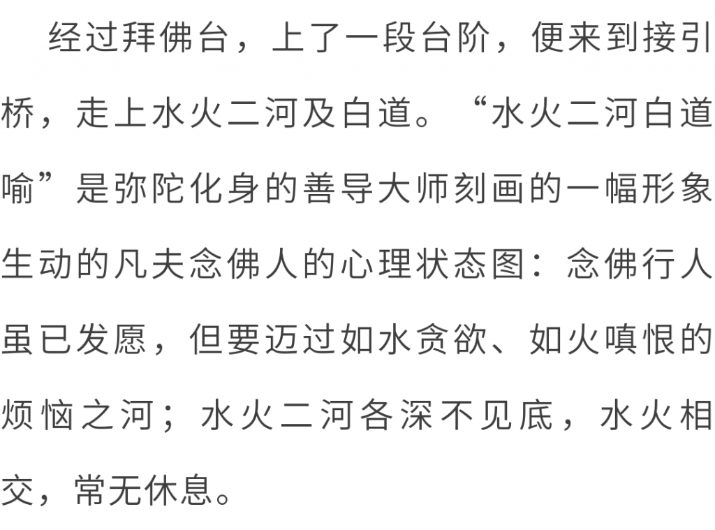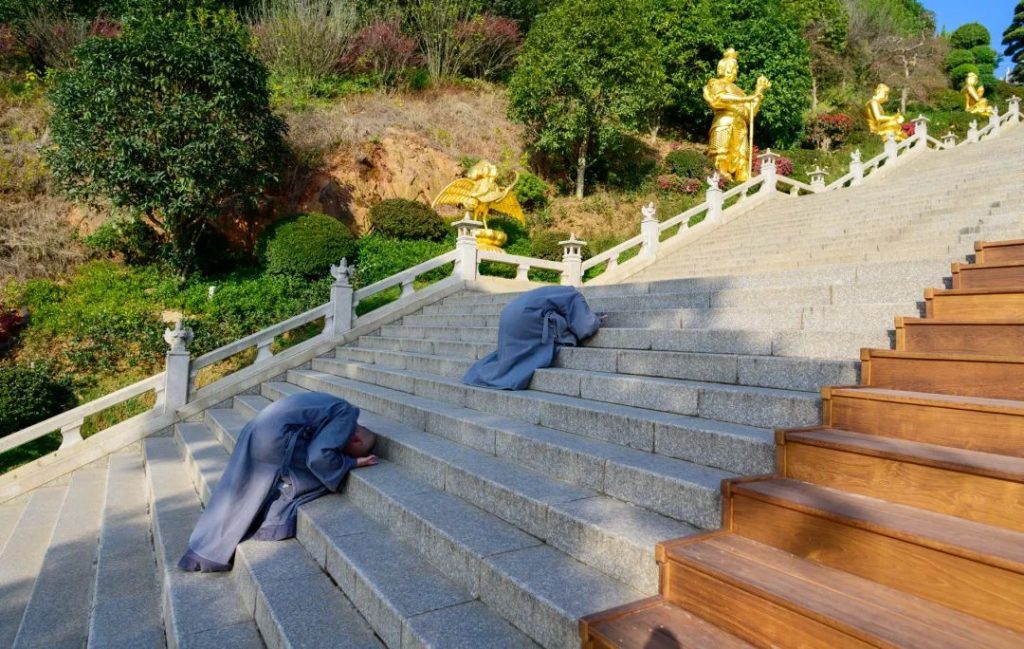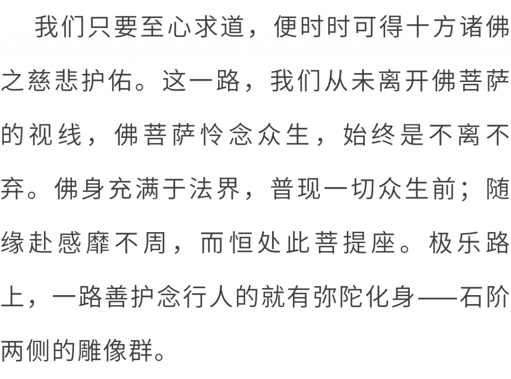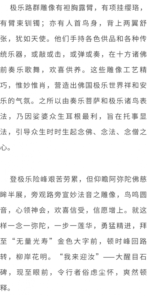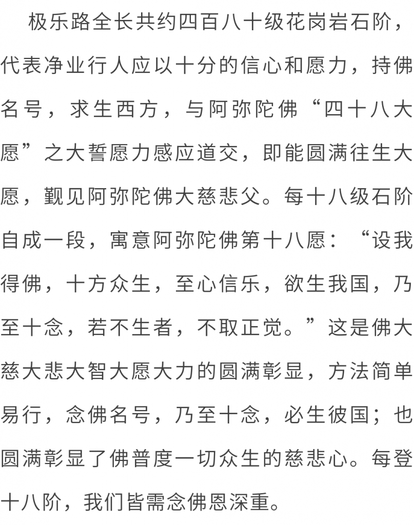 虔礼中轴线,诚登极乐路;拳拳佛子心,漫漫修行旅。修行如登山进阶,需从低处,一步一步、一门心思、全身投入,路途中更需不畏艰险、矢志不渝,方可登上妙高峰顶。《西游记》讲唐僧上西天取经要经历九九八十一难,可见成佛不是一件容易的事情,需要克服身心上的各种障碍和烦恼,战胜一路上的“妖魔鬼怪”,最后才能取得真经、修成正果。