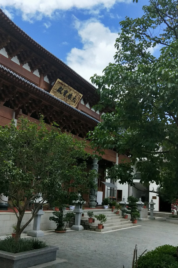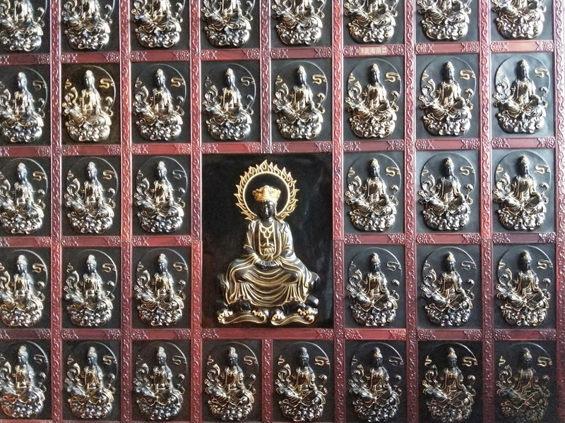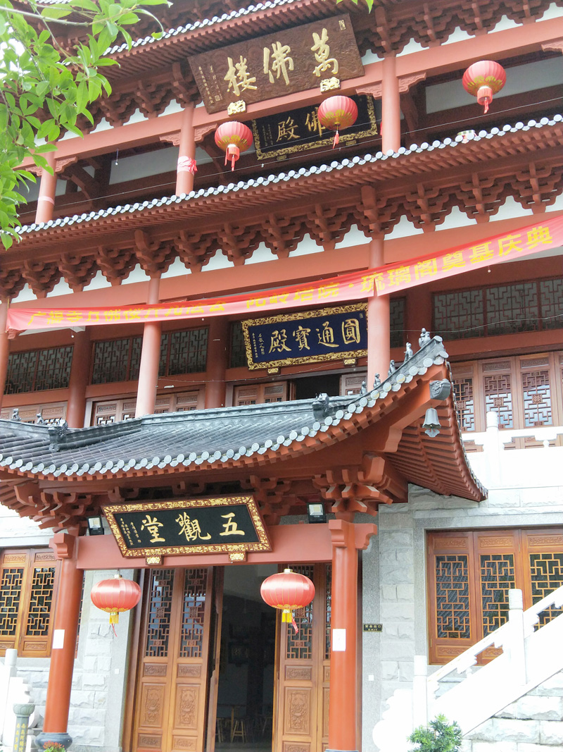 万佛楼,第一层为五观堂,作为讲学修道场所。第二层为圆通殿,供奉6000多尊观音像,观音菩萨佛像系脱胎漆器精制而成。第三层为卧佛殿,卧佛身长7.8米,重10吨多,并有5000多尊佛像。佛像面如满月,庄严慈祥。