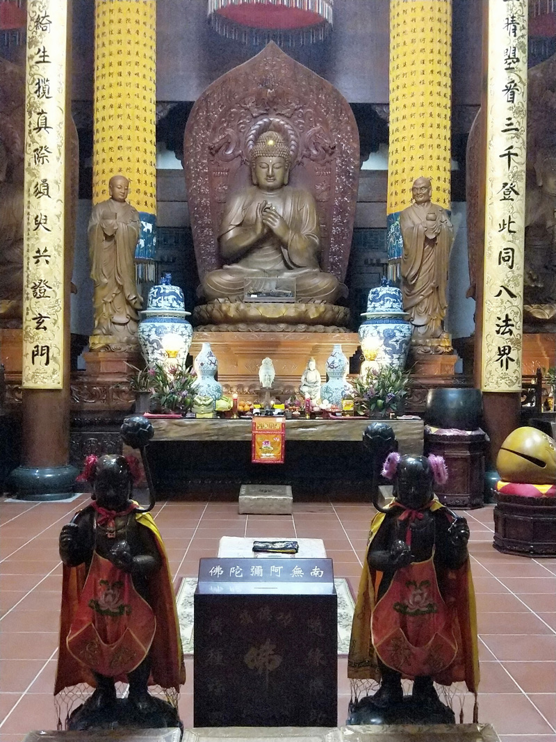 广福寺以红木佛像而著称。佛像庄严古朴,大雄宝殿供奉释迦牟尼佛、药师琉璃光佛、阿弥陀佛等三尊佛像,全由红木精雕而成,高约6.2米。两旁是框式浮雕十八尊罗汉,每面高1.8米、宽1.3米,神态自然,栩栩如生。进入大殿,佛像林立,香烟缭绕,经声朗朗,庄严肃穆。