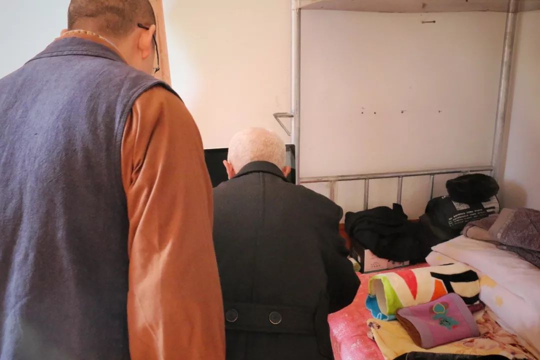 你也可能在窗外阴雨绵绵的房间里,看到贤志法师,在为一群老人整理床铺,打扫卫生,此时的他,神情温柔……