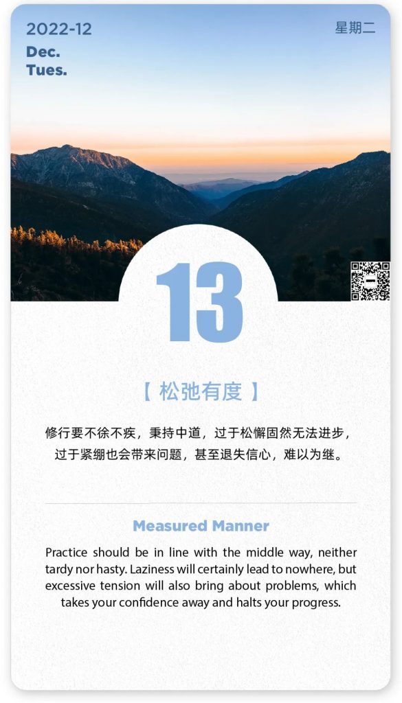 日签 | 松弛有度 静瑛 • 2022年12月13日 下午10:50 • 八点僧音 来源:一念慢生活 时间:2022-12-13 本网站属于非赢利性网站,转载的文章遵循原作者的版权声明,如有版权异议,请联系值班编辑予以删除。 联系方式:0591-83056739-818 18950442781 赞 (1) 静瑛 0 0 生成海报 如诚长老:功夫上去了,气脉就通了,冬暖夏凉 上一篇 2022年12月13日 下午10:45 日签 | 理性消费,拒绝浪费 下一篇 2022年12月13日 下午10:53 相关推荐 八点僧音 静波法师:说真话他不信不听,说假话他反而高兴…… 100 编辑:庄雅婷 2024年2月15日 八点僧音 梦参老和尚:百看不厌,五台山“段子手” 000 三三两两 2024年1月10日 八点僧音 大愿法师:孝顺父母要从五个方面来做 000 三三两两 2024年2月28日 八点僧音 走过中阴“险峡”,是需要本钱的 100 三三两两 2024年7月18日 八点僧音 大安法师:放弃工作在寺院长期做义工可以吗? 300 编辑 志斌 2022年11月30日 八点僧音 净界法师 : 你不要管你的烦恼厚薄,也不要管罪业深浅,重点就是你的善根福德力要够 000 三三两两 2024年5月15日 八点僧音 梦参长老:虽然是平常事, 可这就是最深奥的佛法 000 smy 2023年3月25日 八点僧音 在喧嚣中寻找心灵的净土… 000 三三两两 2024年7月30日 八点僧音 虚云老和尚:众生被七情五欲转,故自性不明生死不了 ! 200 三三两两 2024年12月17日 八点僧音 什么是执着?怎样算放下? 000 三三两两 2024年5月31日 发表回复 您的邮箱地址不会被公开。 必填项已用 * 标注*昵称: *邮箱: 网址: 记住昵称、邮箱和网址,下次评论免输入 提交