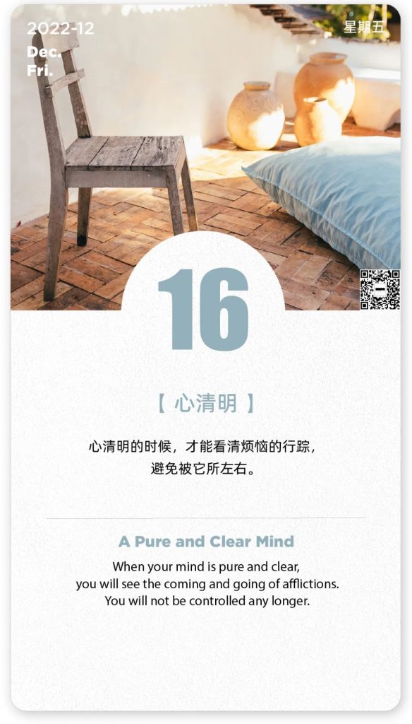 日签 | 心清明 静瑛 • 2022年12月16日 下午6:22 • 八点僧音 来源:一念慢生活 时间:2022-12-16 本网站属于非赢利性网站,转载的文章遵循原作者的版权声明,如有版权异议,请联系值班编辑予以删除。 联系方式:0591-83056739-818 18950442781 赞 (0) 静瑛 0 0 生成海报 悬鼓堂 | 四大五蕴本无我 见见离见见弥陀 上一篇 2022年12月16日 下午6:19 【印光法师答念佛600问】| 34、《无量寿经》的要义是什么? 下一篇 2022年12月16日 下午6:29 相关推荐 八点僧音 济群法师:若我们相遇在时间之外…… 000 三三两两 2024年2月16日 八点僧音 弘一法师|在寺院随意坐卧、乞索、取借,甚至使用暴力,会结下很重的罪业…… 000 三三两两 2025年2月26日 八点僧音 起心动念皆是因,当下所受皆是果 100 三三两两 2024年5月15日 八点僧音 绍云老和尚:遇到这样的事情,不把它当回事,那就是积阴德! 000 三三两两 2025年8月1日 八点僧音 三叁法师:在世间中,保持觉醒 000 三三两两 2024年4月10日 八点僧音 界诠法师:能够远离财色,就超脱了世间种种苦果 100 三三两两 2024年5月11日 八点僧音 绍云老和尚:佛法表面上看很兴盛,现在找正知见的都少了 000 编辑:庄雅婷 2024年7月3日 八点僧音 怀疑是修道最大的障碍 000 三三两两 2024年11月1日 八点僧音 【佛教知识】“信佛只要心诚,并不一定要皈依”,这种想法对吗? 000 smy 2023年3月30日 八点僧音 如何得心安? 000 三三两两 2025年8月7日 发表回复 您的邮箱地址不会被公开。 必填项已用 * 标注*昵称: *邮箱: 网址: 记住昵称、邮箱和网址,下次评论免输入 提交