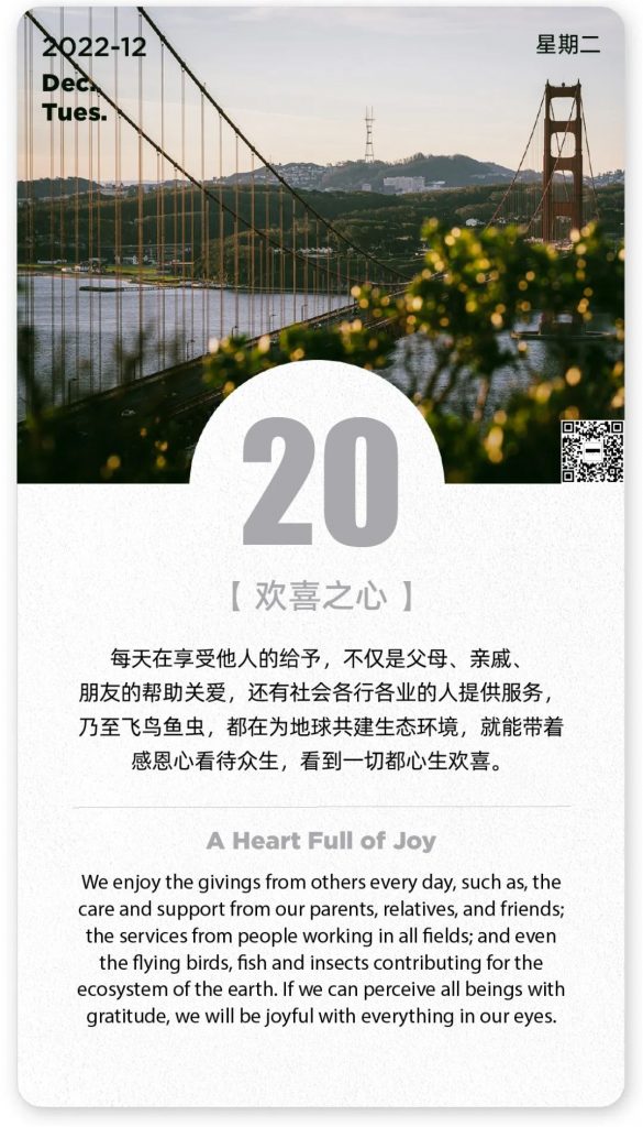 日签 | 欢喜之心 静瑛 • 2022年12月20日 下午5:55 • 八点僧音 来源:一念慢生活 时间:2022-12-20 本网站属于非赢利性网站,转载的文章遵循原作者的版权声明,如有版权异议,请联系值班编辑予以删除。 联系方式:0591-83056739-818 18950442781 赞 (0) 静瑛 0 0 生成海报 观察|看祖师经典一定要了解历史背景再解读,不要依文解义 上一篇 2022年12月20日 下午5:55 绍云老和尚:虚云长老为什么选这一年圆寂!原来是预知将发生这件大事… 下一篇 2022年12月20日 下午6:02 相关推荐 八点僧音 让自己心静如水 让妄想无处可生 000 三三两两 2024年6月14日 八点僧音 绍云长老珍贵开示:我们现在得了人身,又闻到佛法,这是最大的庆幸事 100 smy 2023年6月23日 八点僧音 德林老和尚:进入常寂光,与众生就没得缘了吗? 100 编辑:庄雅婷 2024年3月15日 八点僧音 如果生活是修行,朋友圈就是道场! 000 三三两两 2024年6月21日 八点僧音 梦参老和尚:起床一下地时,你念这个偈子,一天都不犯罪 100 三三两两 2025年8月6日 八点僧音 修行路上,傲慢是一道需要跨过的坎 000 三三两两 2025年6月9日 八点僧音 泥牛入海、一丝不挂……几个源自佛教的成语,你知多少? 000 smy 2023年4月25日 八点僧音 心生欢喜 笑对生活 大肚能容 000 三三两两 2025年8月7日 八点僧音 微课程|快问快答:认识皈依 000 smy 2023年5月12日 八点僧音 你真的理解“随缘”吗? 000 三三两两 2024年12月3日 发表回复 您的邮箱地址不会被公开。 必填项已用 * 标注*昵称: *邮箱: 网址: 记住昵称、邮箱和网址,下次评论免输入 提交