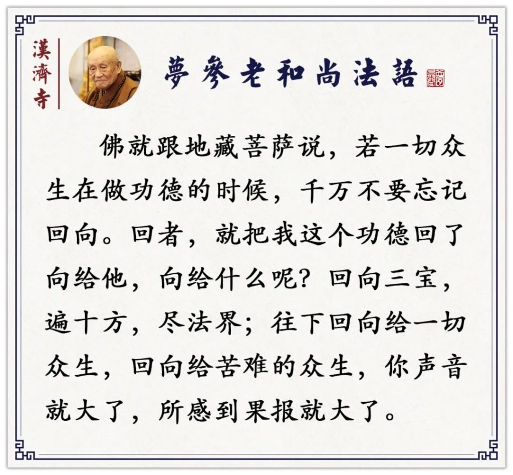 每天下班要回向,回向给自己的妈妈、爸爸。爸爸、妈妈都在的,给他们回向,让他们身体健康;不在了,回向让他们生极乐世界——不管他们在哪一道,假你们回向的力量、念经的力量,把他们从那一道度到极乐世界,那你们所做的事才不会白干。