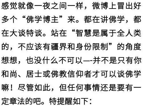 3、不要随意涉及戒律的讲说。戒律是讲给正在求戒、学戒、持戒的人听的,故讲戒者本人必须是严持戒律的。即使是探讨戒律内容,探讨者彼此各方都应该处于谦恭敬畏谨慎惕厉的状态。决不是一个纯粹的旁观者在酒足饭饱甚至乌烟瘴气之余,大言不惭高谈阔论的品评谁这条戒谁那条戒如何的。佛门内部对讲戒的法师有足以让你们生畏的苛刻要求,这个你们或许真应该知道一点才好!