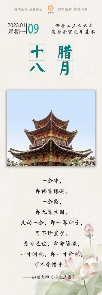 莲音历 | 一寸时光,即一寸命光 静瑛 • 2023年1月10日 下午3:49 • 八点僧音 来源:东林寺文宣部 江西庐山东林寺 时间:2023-01-09 本网站属于非赢利性网站,转载的文章遵循原作者的版权声明,如有版权异议,请联系值班编辑予以删除。 联系方式:0591-83056739-818 18950442781 赞 (0) 静瑛 0 0 生成海报 纪念|腊月十九 南阳慧忠国师圆寂日——独留无缝塔 寒空照明月 上一篇 2023年1月10日 下午3:45 124岁奇僧预知时至,安详坐化,选定奇人继任住持 下一篇 2023年1月10日 下午4:19 相关推荐 八点僧音 八风不动心,宁静无烦恼,自然日日吉祥! 000 三三两两 2024年9月6日 八点僧音 净界法师:愚痴跟邪见有什么差别 000 三三两两 2025年6月27日 八点僧音 这种念佛方法花不了多少时间,能天天这样修,功夫很大 000 三三两两 2024年7月29日 八点僧音 印光大师:不求一心、散心念佛皆为错! 000 三三两两 2024年4月19日 八点僧音 总在男女相上转来转去,是脱不出去轮回的 000 三三两两 2025年4月14日 八点僧音 绍云长老: 现在开悟证果的人难找了,正知正见的都少了,都是搞名搞利 100 三三两两 2024年10月23日 八点僧音 《百喻经》选读 | 破五通仙眼喻 000 静瑛 2022年12月27日 八点僧音 倓虚老和尚:诵经、念佛应注意之事宜 000 三三两两 2025年11月3日 八点僧音 “淫欲”太重的人,身上有这3种特征,请务必远离! 000 三三两两 2024年5月8日 八点僧音 佛法第一重视的就是见地 000 三三两两 2025年6月27日 发表回复 您的邮箱地址不会被公开。 必填项已用 * 标注*昵称: *邮箱: 网址: 记住昵称、邮箱和网址,下次评论免输入 提交