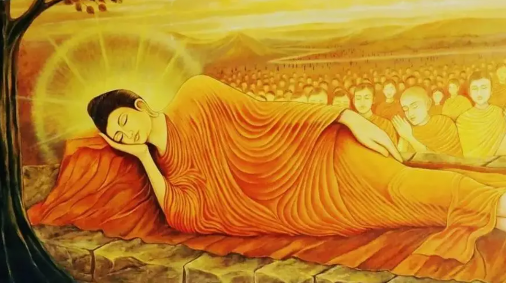 一日,佛陀带着众弟子到了拘尸那罗城外。这里有两株娑罗树,中间绿草如茵,上下繁花似锦。佛陀命阿难在两棵树之间铺好卧具,然后头朝北面,右胁着席,叠足安卧。中夜之时,佛陀对众弟子说完了最后的遗教,便默然无声,安祥示寂。