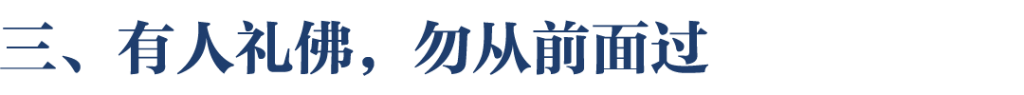 在佛堂内,见有人跪地礼拜佛菩萨时,勿从前面经过,我们凡人是无福消受人家之礼拜。他在拜佛,你从前面经过,不是等于在拜你吗?这点礼节,有很多人都会疏忽。