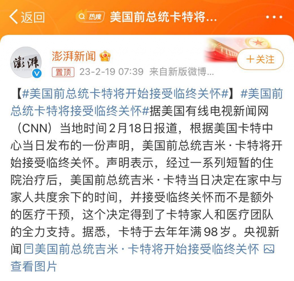 前阵子,澎湃新闻发布了一条微博,带话题 #美国前总统卡特将开始接受临终关怀#。冲上了热搜榜。
