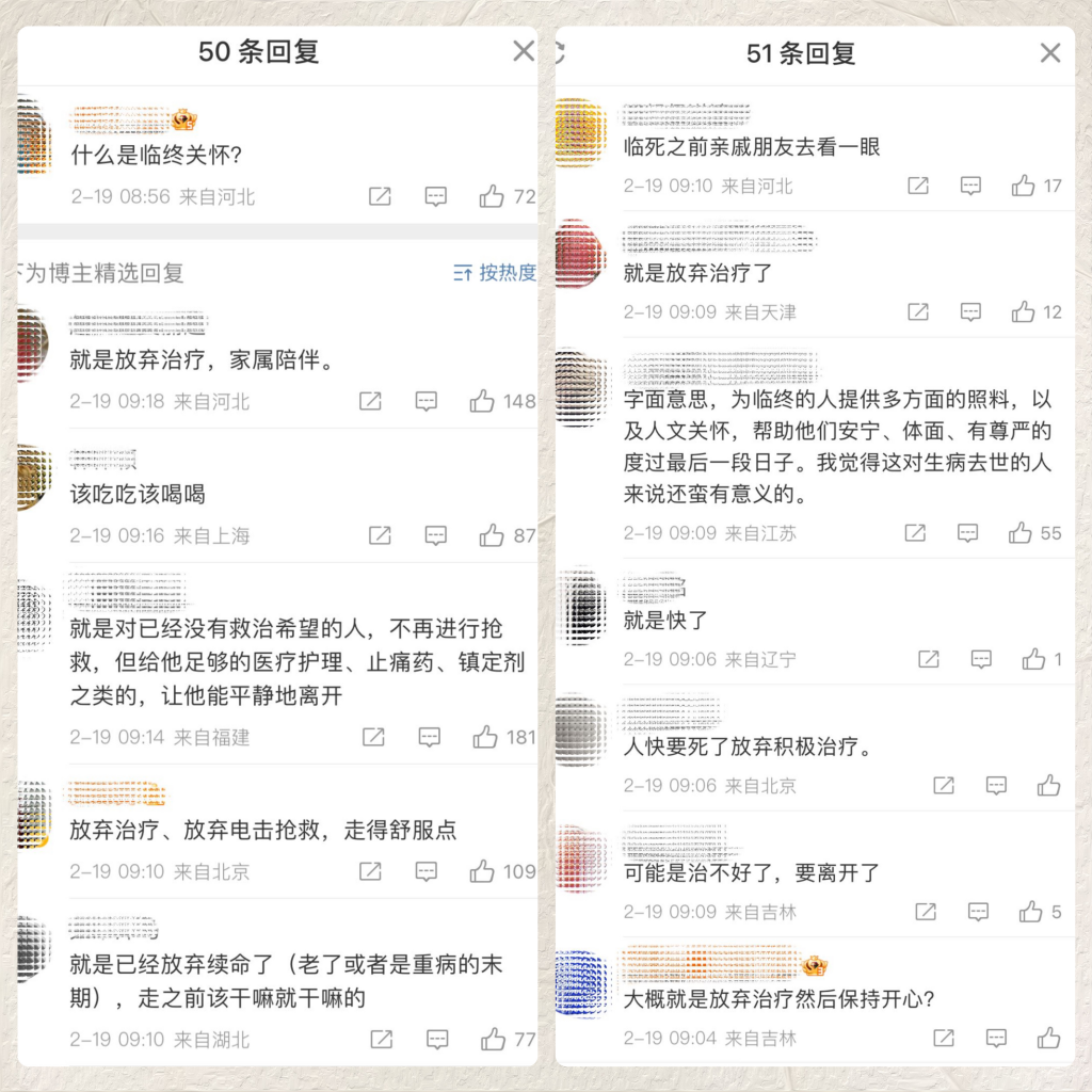从网友们的回复看来,“临终关怀”这个话题确实值得一聊,要谈“临终关怀”,我们首先不免要说起“死亡”。很多人不愿意说“死”,首先觉得这件事离自己很远,其次提起会觉得“晦气”或“害怕”。