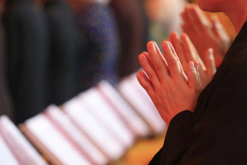 我们供养完法会圣众后,就要紧接着观想自己与一切众生在三宝前顶礼皈依,心中念诵皈依偈颂。