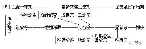 在罗什以前所传译的,有禅教律密净,般若、法华、华严(单品)。那时候的大德们,只把它当做佛教来传译、来宏扬,根本就没有宗派存在,所以不该拿后来宗派的眼光去衡量它。他们都直宗于佛只是一味的佛法。而且、后来中国佛教佛本的主动流就是确立在这个时期,所以可以叫它作“佛本主源一味时期”,其代表人物可以说是道安。罗什来华以后,传入了龙树的论典,才有宗派的见解发生。从罗什以后,僧肇、僧朗(摄山)到兴皇与嘉祥而成三论宗,旁出僧导僧嵩到梁三大法师的成实论宗,这是性空论旁支的入流。自从北魏菩提流支传译无著世亲论典建立了地论宗,继之有陈真谛的传译而为摄论宗,到李唐玄奘更大量的翻译而有唯识宗及旁带的俱舍宗的建立,这可以说是唯识论旁支的入流。这传学本理而宗论的性空唯识二支,虽大大影响了佛本论主流。但终不能夺其主流而代之。自道安以来,有慧远、觉贤、慧思、达摩、智者、杜顺、慧能等,且收且破,而性空论终由智者融摄而为天台宗,唯识论亦由法藏融摄而为贤首宗。所以自罗什以来,虽然性空唯识二旁支加入法流,但始终是以佛本论为主动流的。唐朝自慧能以来,禅宗独特兴盛,净土也渐遍的流行,正如中华佛教之三大系一文里所说的:“注重修行即为净土宗。吸收(法华涅槃及龙树系)演教即为天台宗。专崇悟证即为禅宗。吸收(华严楞伽及世亲学系)演教即为贤首宗。此中国晚唐以来之佛教所由行证不出禅净、教理不出台贤欤”!这说明了佛本论主动流的递演不绝,也正是所以成为“中国佛学”之特质所在。现在把他归摄为下表: