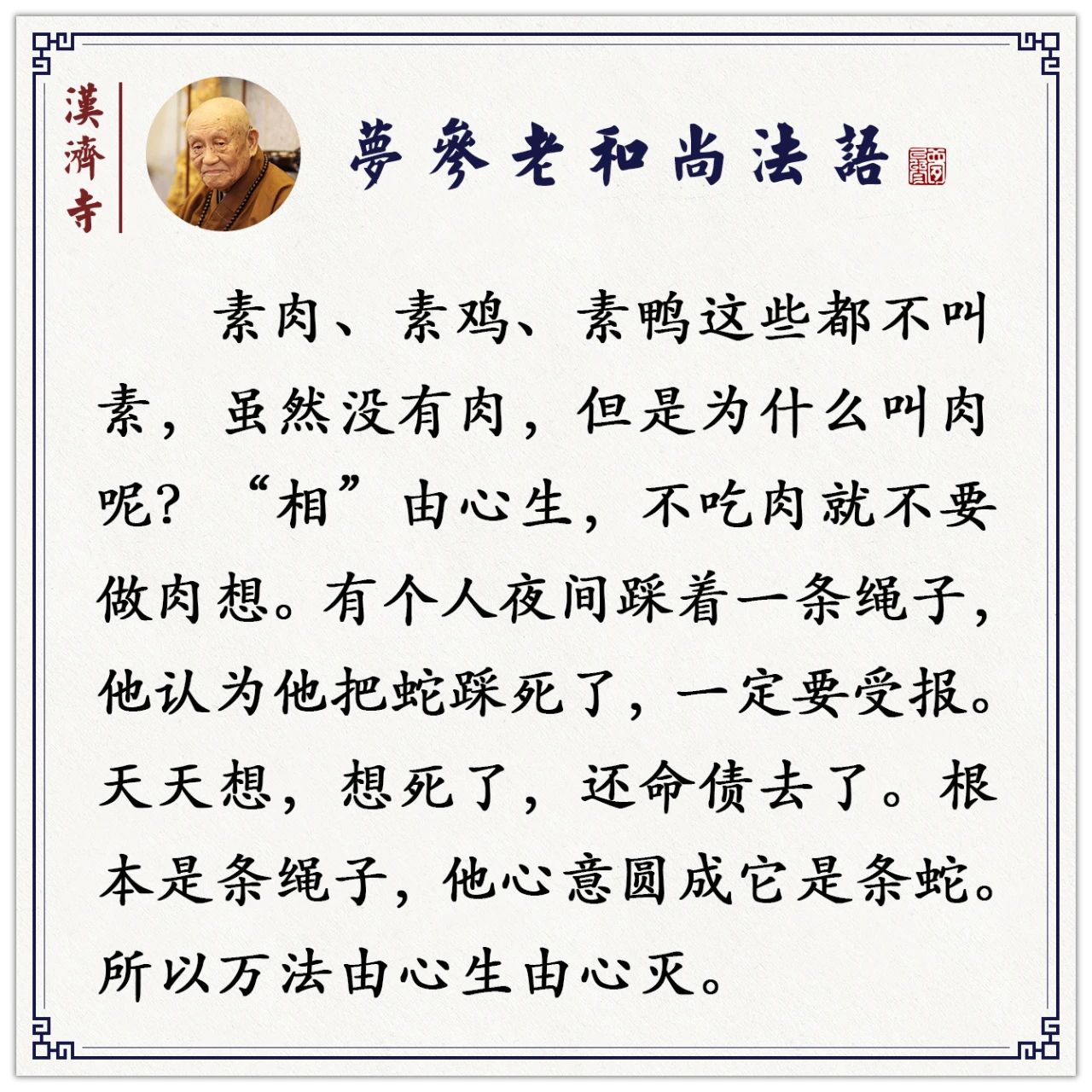 虽然是现在吃素了,吃得很讲究,要吃这个那个的,还有什么素鸡、素鸭、素什么,全都上来了。现在这个素食铺,做得非常像形。我说你吃了,跟吃动物的身体是一样的罪,因为你心里在吃。为什么要这样做呢?