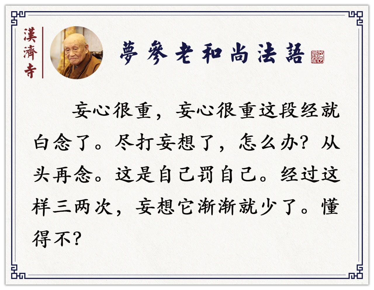 例如,你念经的时候尽打妄想,不念经没有事,一打开经本,一坐在那里头,有两种情形:一个是点头打瞌睡,一个就是不晓得念哪儿去了。面对这种情形,你自己要罚你自己。怎么罚啊?从头念起!看你第二遍还注意不注意?不注意,你再从头念起,这样就注意了。