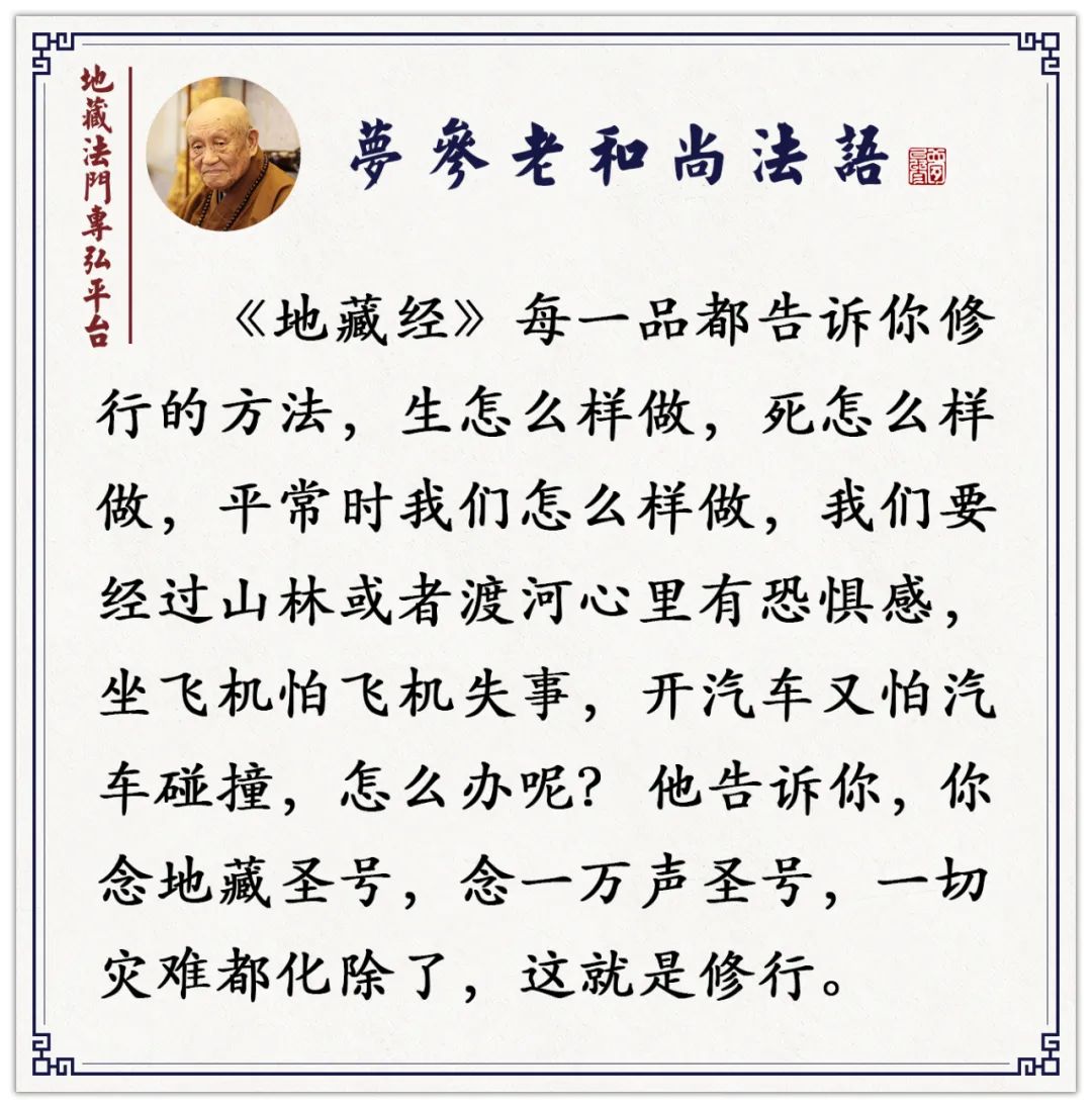 同时这一方灾难很多,瘟疫,现在这水灾、火灾,都以地藏法门来救度。经文上都说的有,跋山渡海,到有危难的国土,念诵《地藏经》。这在最后《见闻利益品》,释迦牟尼佛嘱托观世音菩萨弘扬地藏法门,等我们讲到经文里头再详讲,在没讲之前大概跟大家说一说。你要学《地藏经》的时候怎么样学,就是怎么样做,遇到灾难的时候。不过经文更详细一点,在没有讲前跟大家说一说。梦参老和尚《地藏菩萨本愿经》讲记