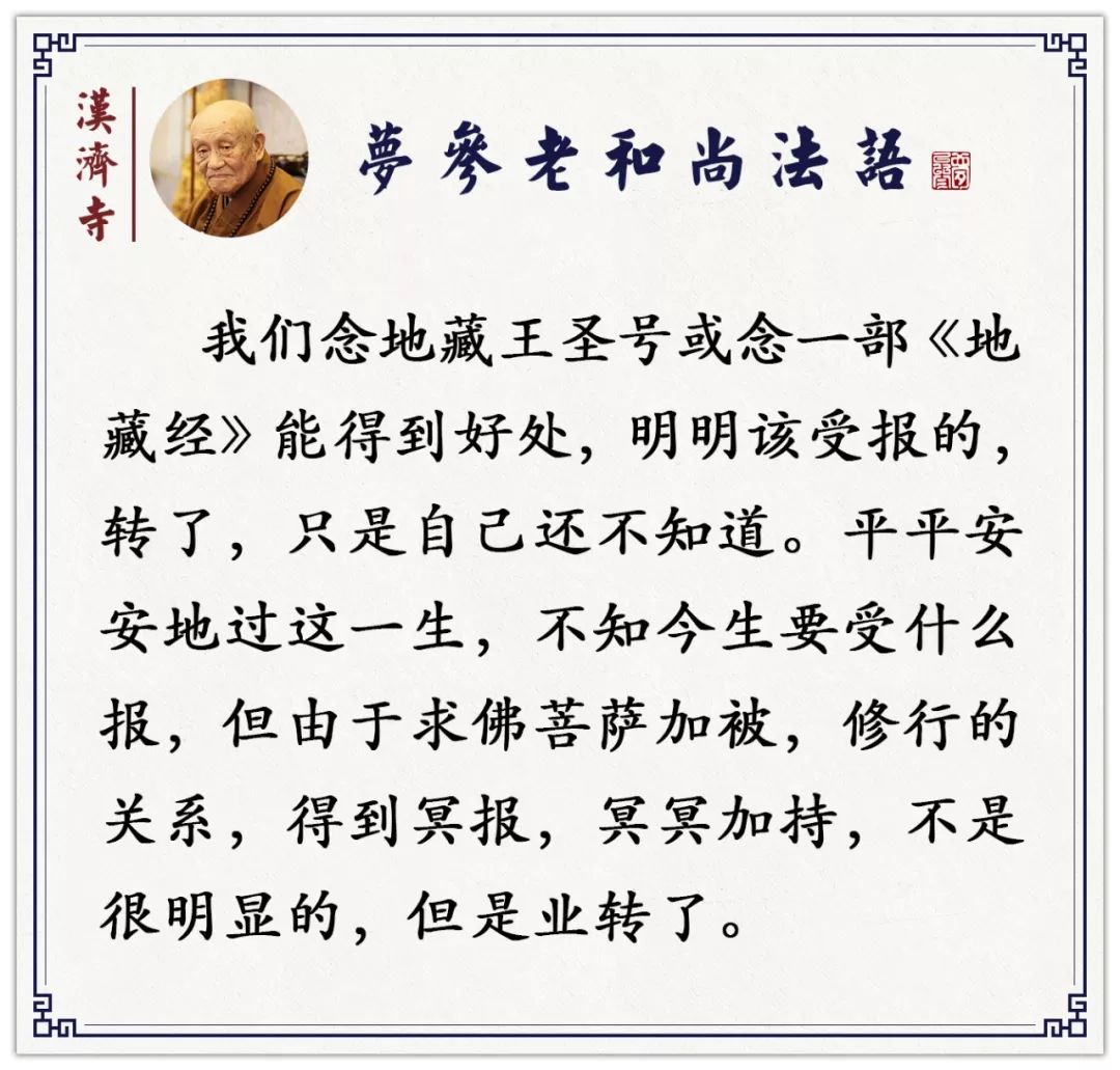 梦参老和尚 答:“佛法说,定业不可转,还有下一句话——三昧加持力。” 定业不可转,但是用拜忏的力量,假地藏菩萨的力量,转了。 定业是可转的,如果定业不可转,没有人能成佛。众生能成佛吗?释迦牟尼佛有业没有啊?他也是修道成的佛,那他的业有没有转啊? 《地藏经》上,地藏菩萨前世有业没有啊?“定业不可转”,但是“三昧加持力”!你转得动转不动?这可是问题了。 你修三昧就转了。我们以前也不信佛,有很多的业,但是信佛之后,读诵大乘、信念三宝,这一念心就转了。