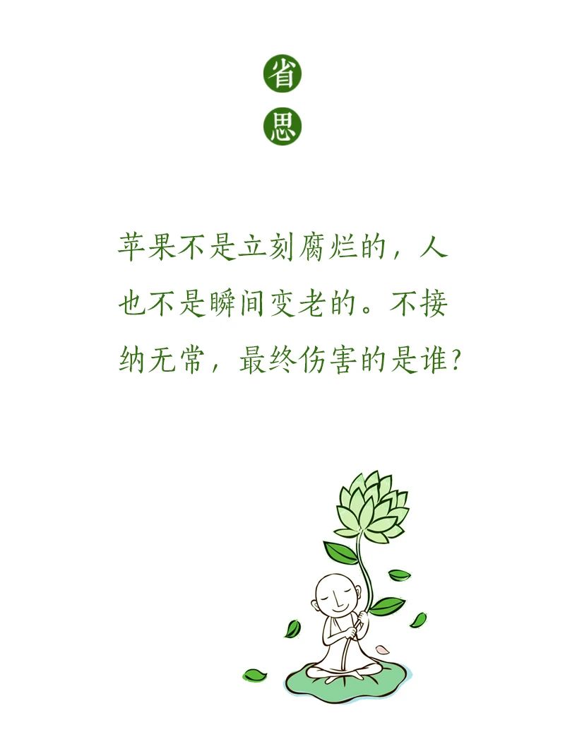 也就是说,这种变化从不停息,哪怕任何一个极短的瞬间,都在不停地变化。就像苹果,不是在某个特定时刻腐烂的,而是在它看似完好时就趋于败坏了。人生也是一样,从我们出生的那天起,没有一刻不在生灭变化中,没有一刻不在走向死亡。
