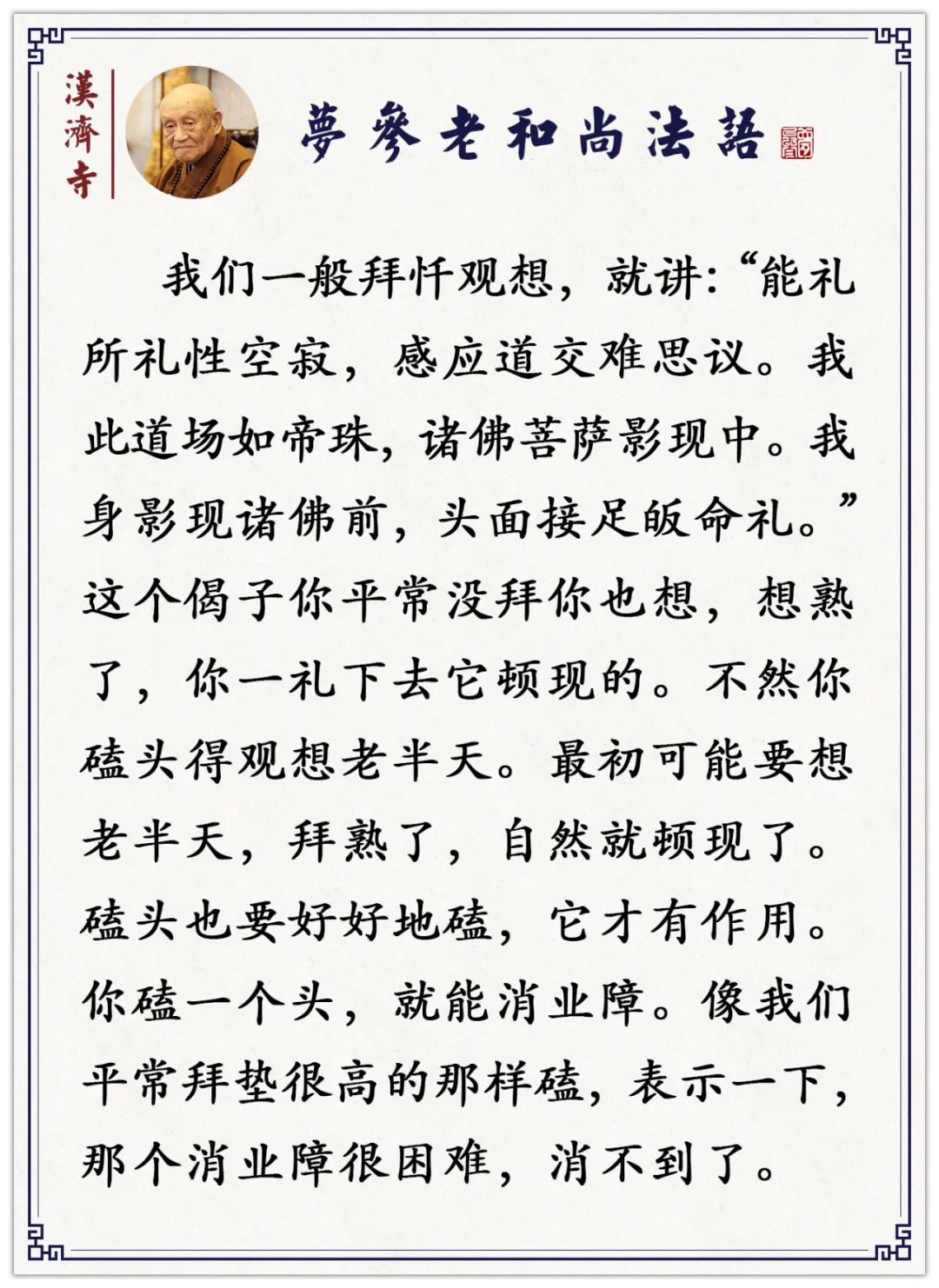 但是千万不要听我讲了,到别人寺庙里随喜功德,或到庄严寺去拜《药师忏》,把人家拜垫摆开说:“梦参法师讲的,这叫我慢礼。”那么你就给我背了黑锅。你随众时随喜好了,心里做如是观想:我这是随缘。我到那去也在拜垫上磕头,有时候人家让我主法就得磕。如果我跪在地上,学藏地来个磕大头,大家恐怕都瞪着眼说我现怪相,给大家的印象不好。