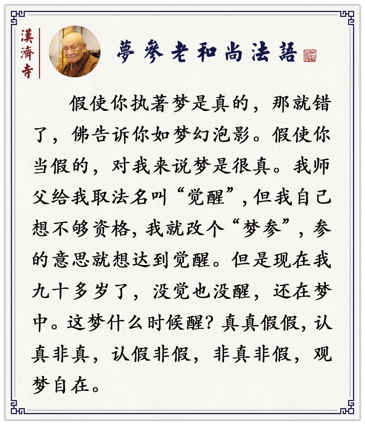 我叫梦参,是因为做梦而出家的。梦是假的,都有可能变成真。我的一生尽做梦,梦很多。把梦当成真的,梦的教育也得着很多。